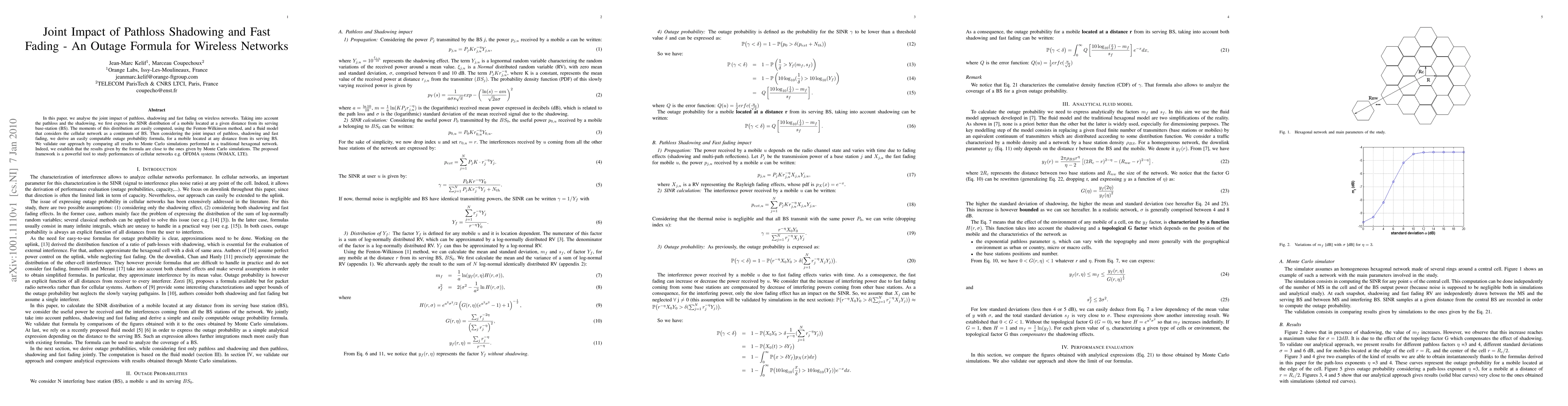 The paper presents a novel outage probability formula for wireless networks that considers pathloss, shadowing, and fast fading, derived using an analytical fluid model.
