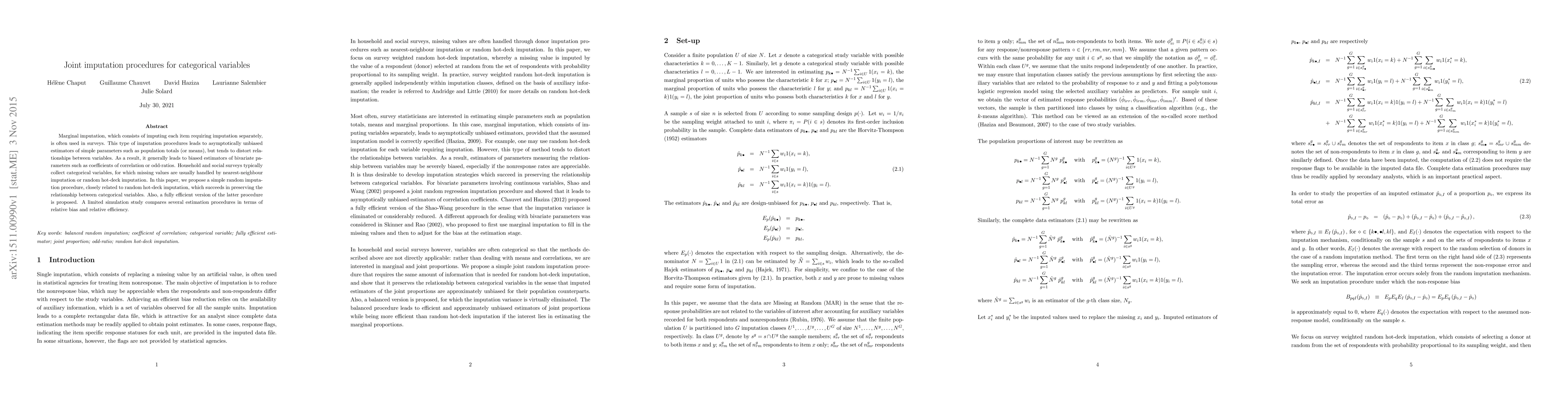 Marginal imputation, which consists of imputing each item requiring imputation separately, is often used in surveys. This type of imputation procedures leads to asymptotically unbiased estimators of simple parameters such as population totals (or means), but tends to distort relationships between variables. As a result, it generally leads to biased estimators of bivariate parameters such as coefficients of correlation or odd-ratios. Household and social surveys typically collect categorical variables, for which missing values are usually handled by nearest-neighbour imputation or random hot-deck imputation. In this paper, we propose a simple random imputation procedure, closely related to random hot-deck imputation, which succeeds in preserving the relationship between categorical variables. Also, a fully efficient version of the latter procedure is proposed. A limited simulation study compares several estimation procedures in terms of relative bias and relative efficiency.