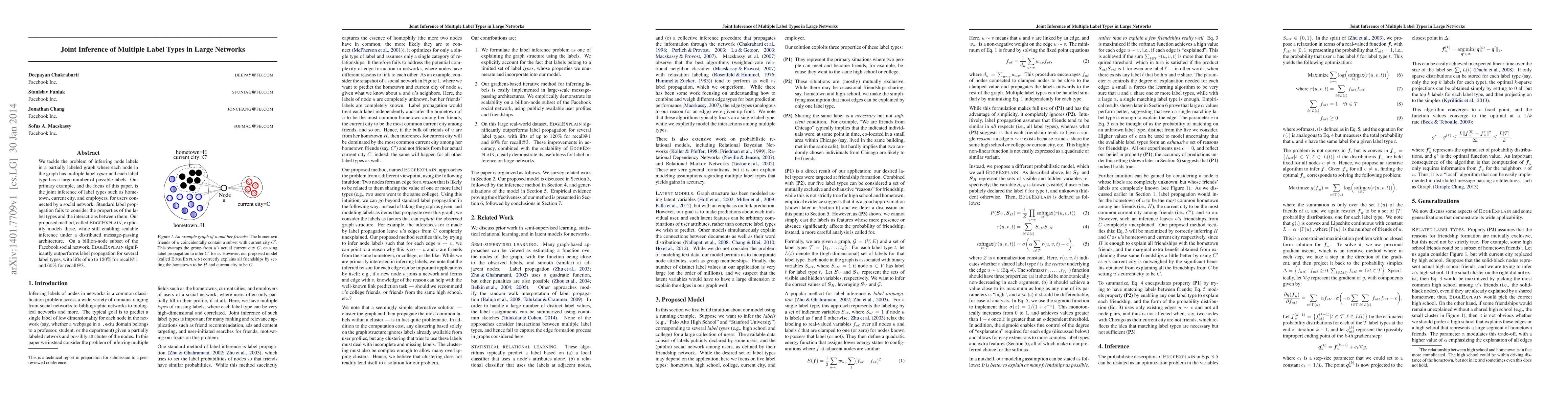 We tackle the problem of inferring node labels in a partially labeled graph where each node in the graph has multiple label types and each label type has a large number of possible labels. Our primary example, and the focus of this paper, is the joint inference of label types such as hometown, current city, and employers, for users connected by a social network. Standard label propagation fails to consider the properties of the label types and the interactions between them. Our proposed method, called EdgeExplain, explicitly models these, while still enabling scalable inference under a distributed message-passing architecture. On a billion-node subset of the Facebook social network, EdgeExplain significantly outperforms label propagation for several label types, with lifts of up to 120% for recall@1 and 60% for recall@3.