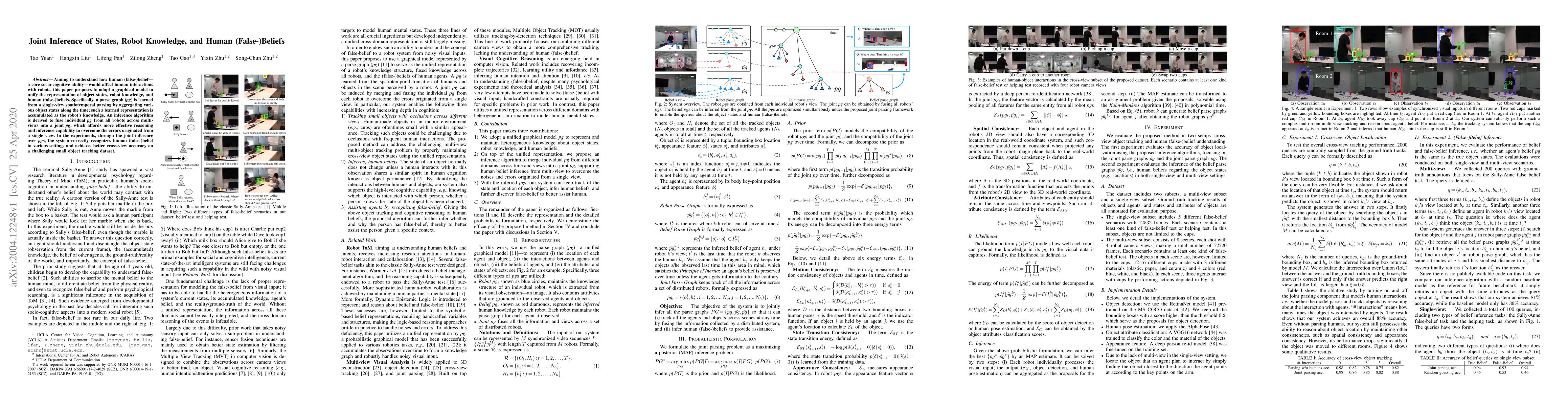 This paper proposes a graphical model to integrate object states, robot knowledge, and human (false-)beliefs for improved human-robot interaction. It uses a parse graph learned from spatiotemporal parsing to represent the robot's knowledge and an inference algorithm to combine these graphs across multi-views, achieving better tracking accuracy and human belief recognition.