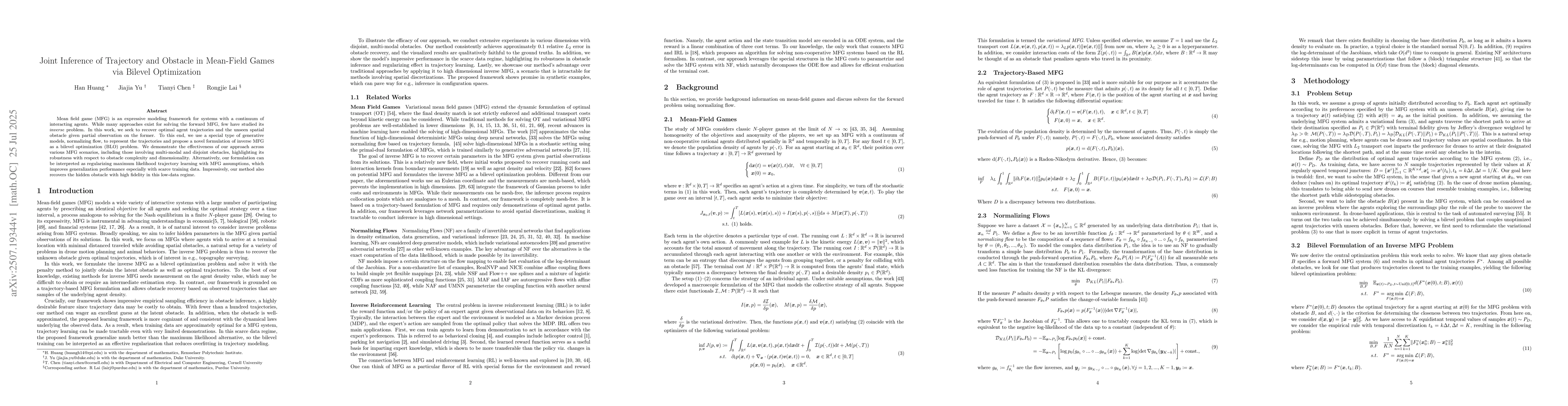 Mean field game (MFG) is an expressive modeling framework for systems with a continuum of interacting agents. While many approaches exist for solving the forward MFG, few have studied its \textit{inverse} problem. In this work, we seek to recover optimal agent trajectories and the unseen spatial obstacle given partial observation on the former. To this end, we use a special type of generative models, normalizing flow, to represent the trajectories and propose a novel formulation of inverse MFG as a bilevel optimization (BLO) problem. We demonstrate the effectiveness of our approach across various MFG scenarios, including those involving multi-modal and disjoint obstacles, highlighting its robustness with respect to obstacle complexity and dimensionality. Alternatively, our formulation can be interpreted as regularizing maximum likelihood trajectory learning with MFG assumptions, which improves generalization performance especially with scarce training data. Impressively, our method also recovers the hidden obstacle with high fidelity in this low-data regime.