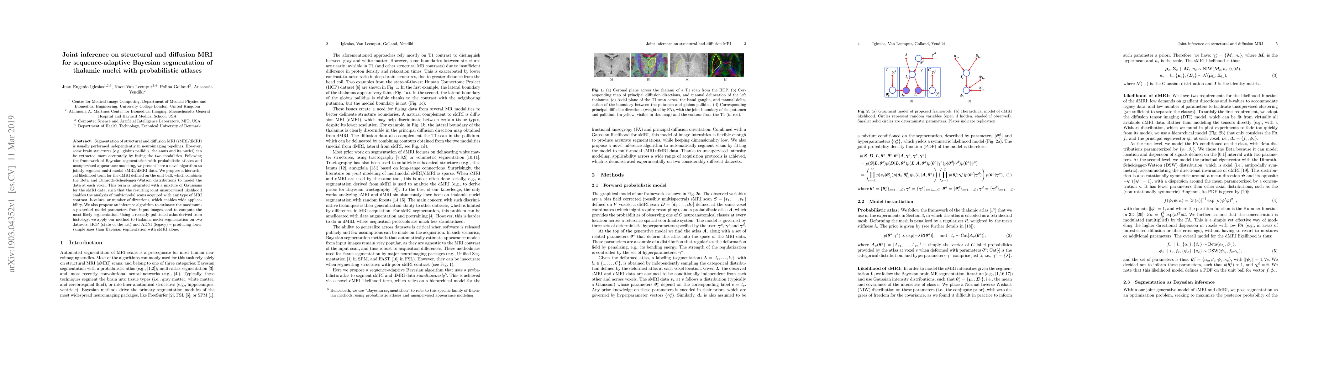 This paper introduces a novel algorithm for joint segmentation of structural and diffusion MRI data using Bayesian segmentation with probabilistic atlases. The method combines Beta and Dimroth-Scheidegger-Watson distributions for diffusion MRI and a mixture of Gaussians for structural MRI, enabling sequence-adaptive segmentation of thalamic nuclei across different MRI contrasts.