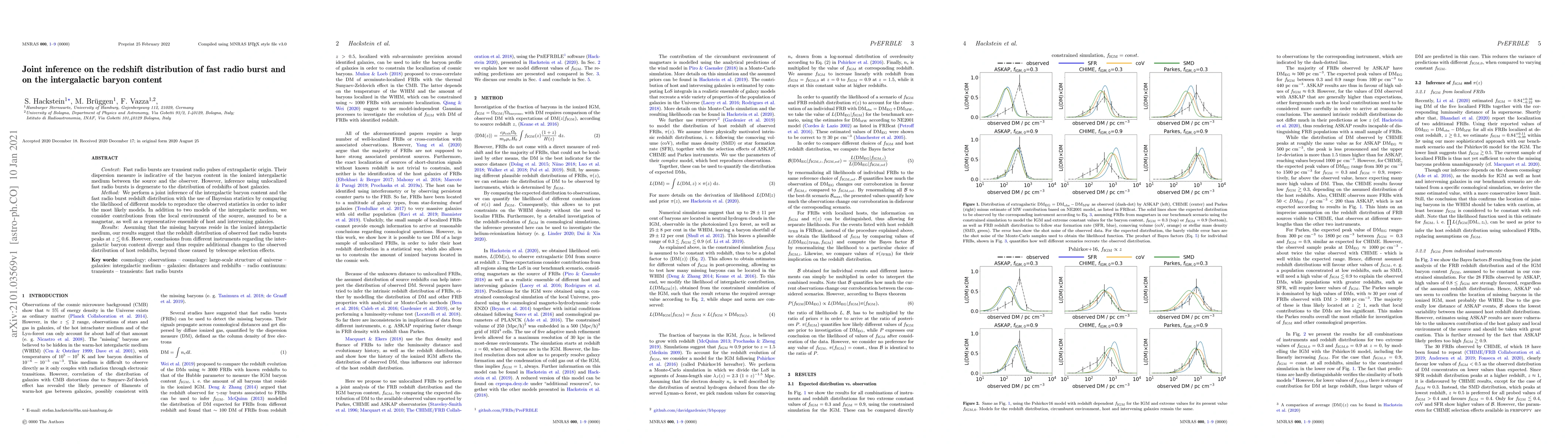 This paper uses Bayesian statistics to jointly infer the redshift distribution of fast radio bursts and the intergalactic baryon content, finding that the observed bursts peak at redshifts around $z \lesssim 0.6$. It highlights discrepancies in conclusions about baryon content from different instruments, suggesting further adjustments to the host redshift distribution.