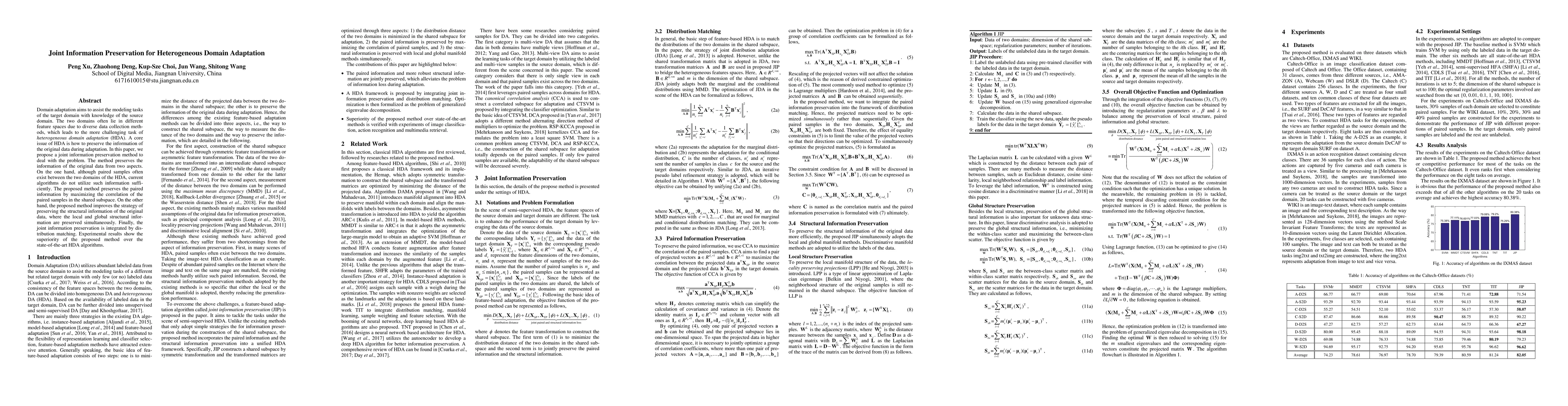This paper introduces a joint information preservation method for heterogeneous domain adaptation (HDA), addressing the challenge of preserving original data information across different feature spaces. The method maximizes correlation of paired samples in a shared subspace and preserves both local and global structural information, outperforming existing HDA algorithms in experiments.