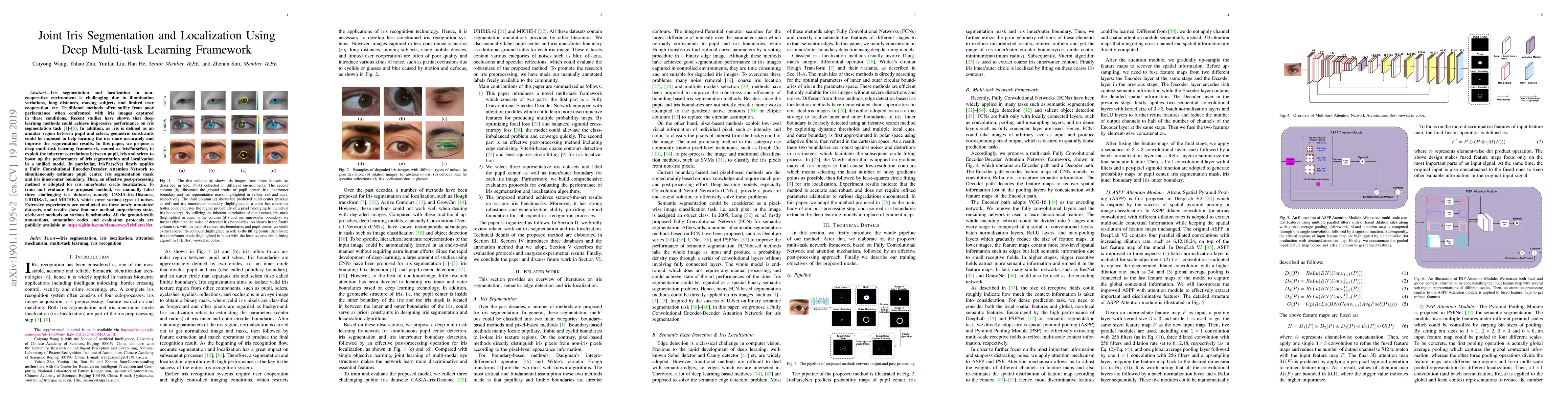 This paper proposes a deep multi-task learning framework, IrisParseNet, to enhance iris segmentation and localization in challenging conditions. It uses a Fully Convolutional Encoder-Decoder Attention Network to simultaneously estimate pupil center, iris segmentation mask, and iris boundaries, achieving superior performance compared to state-of-the-art methods on annotated datasets.
