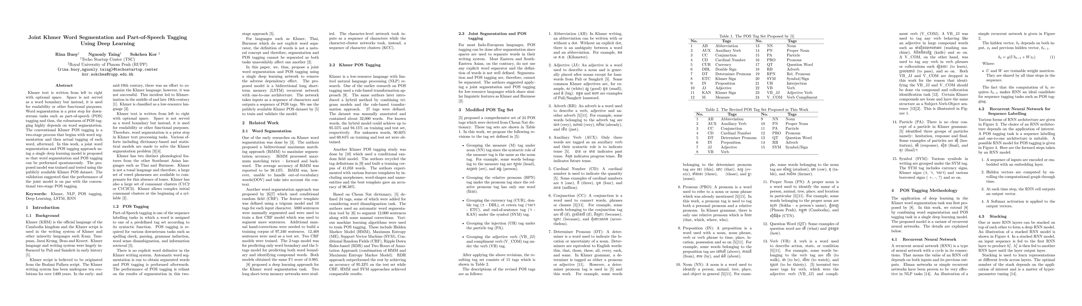 This research proposes a joint deep learning model for Khmer word segmentation and part-of-speech tagging, aiming to improve efficiency by performing both tasks simultaneously. The model's performance is comparable to traditional two-stage methods, suggesting its potential for enhancing downstream natural language processing tasks.