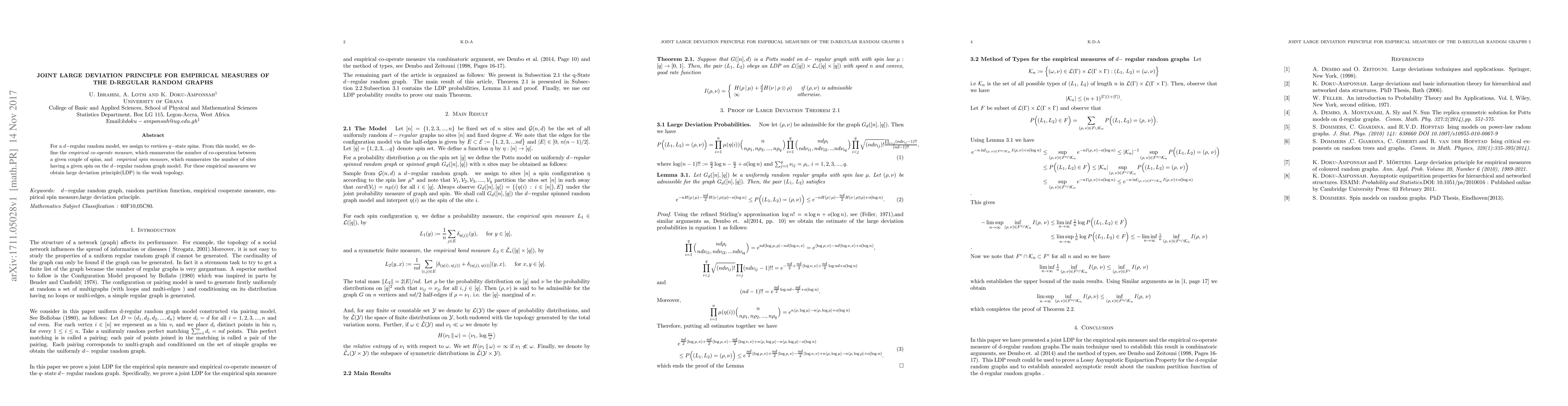 For a $d-$regular random model, we assign to vertices $q-$state spins. From this model, we define the \emph{empirical co-operate measure}, which enumerates the number of co-operation between a given couple of spins, and \emph{ empirical spin measure}, which enumerates the number of sites having a given spin on the $d-$regular random graph model. For these empirical measures we obtain large deviation principle(LDP) in the weak topology.