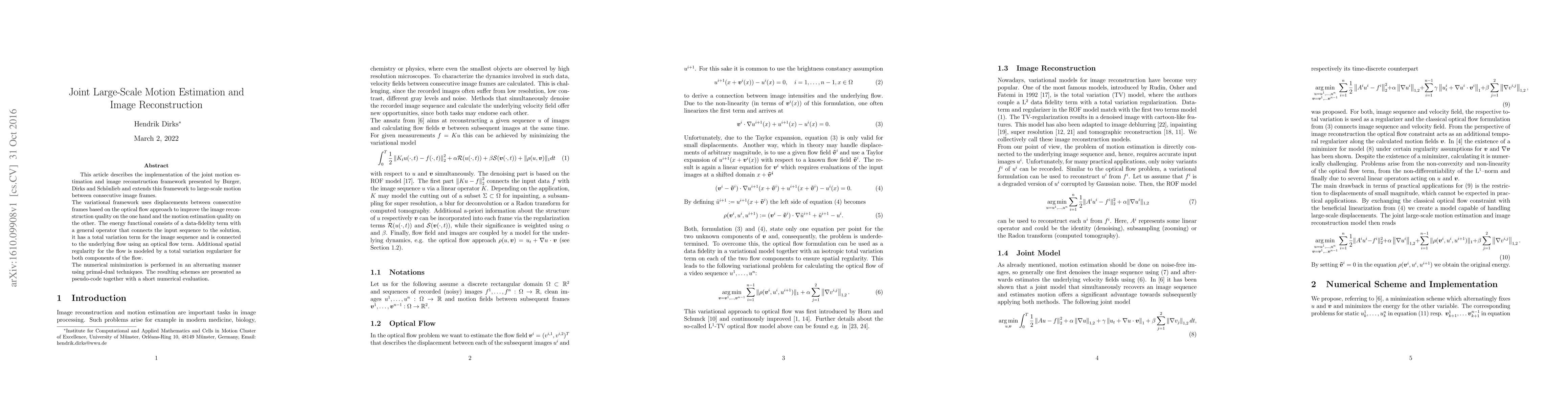 This paper implements a joint motion estimation and image reconstruction framework for large-scale motion between image frames, enhancing both reconstruction and estimation quality through an optical flow approach. The method uses an energy functional combining data fidelity, total variation, and optical flow terms, optimized via primal-dual techniques.