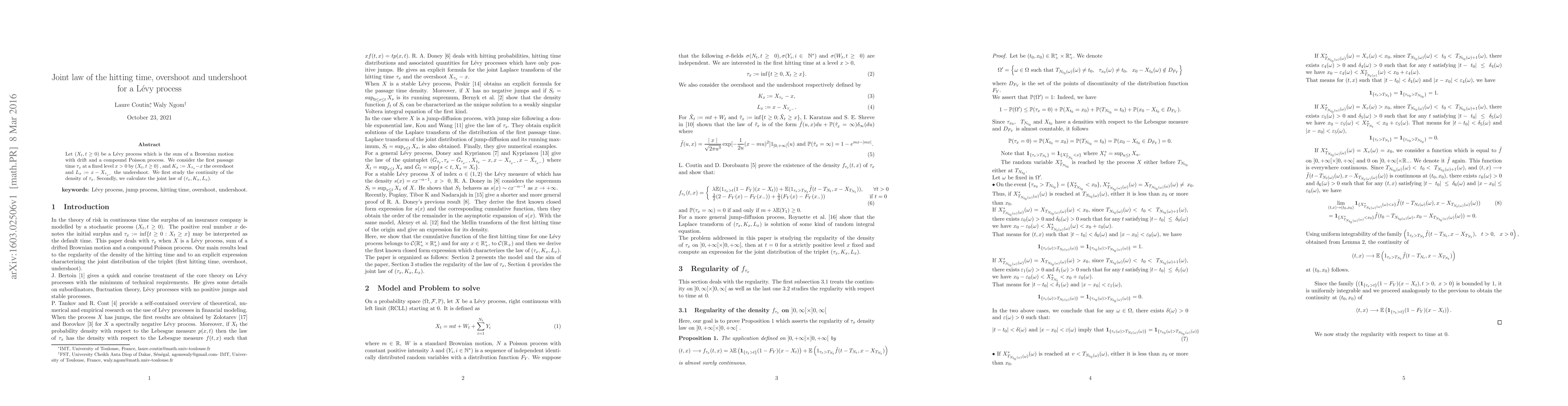 Let be $(X_t, t\geq 0)$ be a L\'evy process which is the sum of a Brownian motion with drift and a compound Poisson process. We consider the first passage time $\tau_x$ at a fixed level $x>0$ by $(X_t, t\geq 0)$ and $K_x:= X_{\tau_x}-x$ the overshoot and $L_x:= x-X_{\tau_x^-}$ the undershoot. We first study the regularity of the density of the first passage time. Secondly, we calculate the joint law of $(\tau_x, K_x, L_x).$