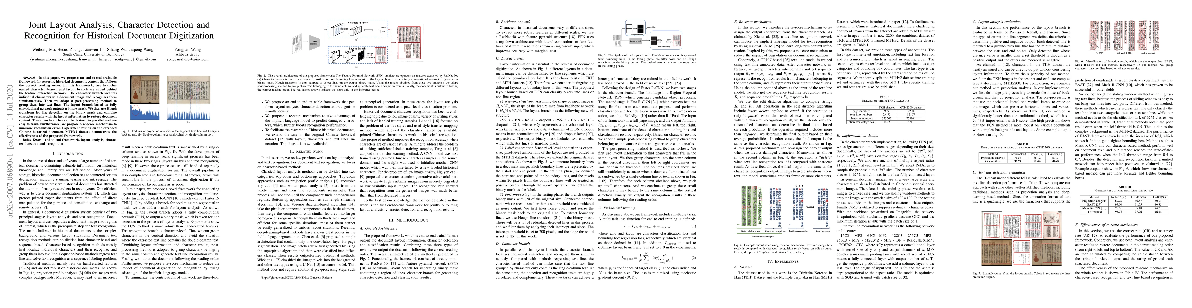 This paper proposes an end-to-end framework for digitizing historical documents, featuring two branches for character detection and layout analysis, which are trained in parallel to restore content in correct reading order. Experiments on the MTHv2 dataset show the framework's effectiveness in character recognition and layout restoration.
