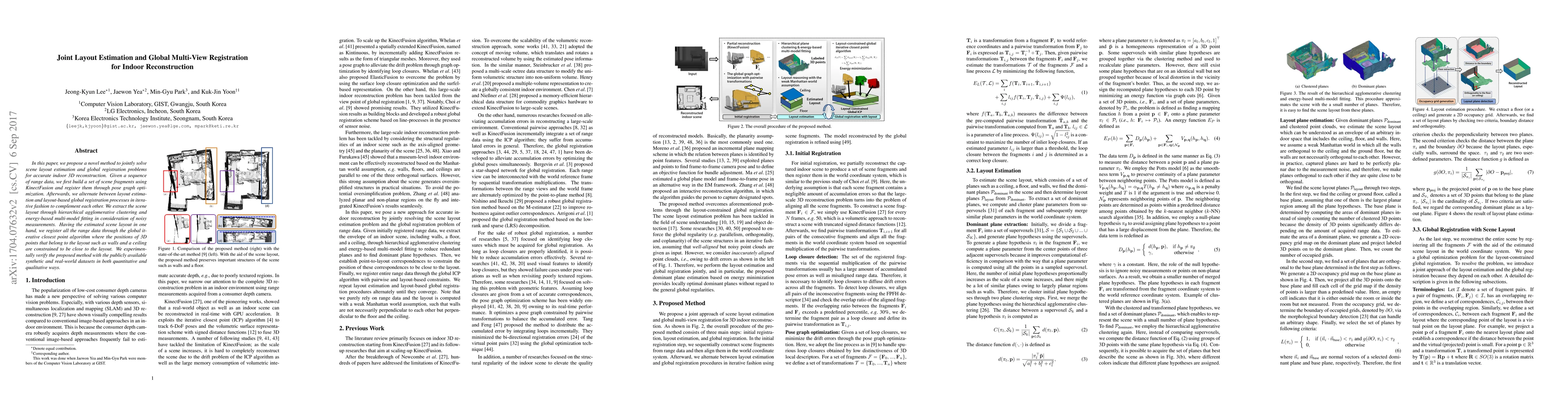 This paper presents a method for joint scene layout estimation and global multi-view registration to achieve accurate indoor 3D reconstruction. It uses KinectFusion for fragment building, pose graph optimization, and iterative closest point registration constrained by estimated scene layout.