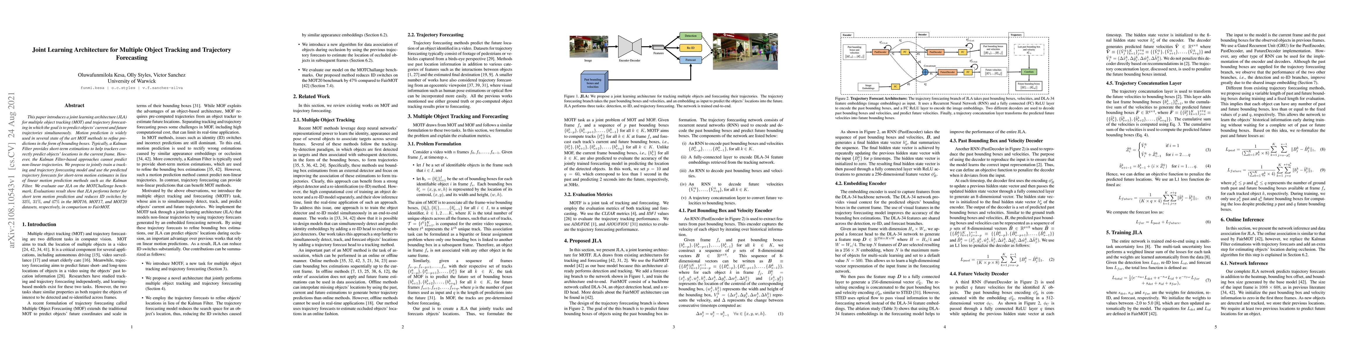 This paper proposes a joint learning architecture (JLA) for simultaneous multiple object tracking and trajectory forecasting, outperforming Kalman Filter-based methods by predicting non-linear trajectories and reducing ID switches by up to 47% on the MOTChallenge benchmark.