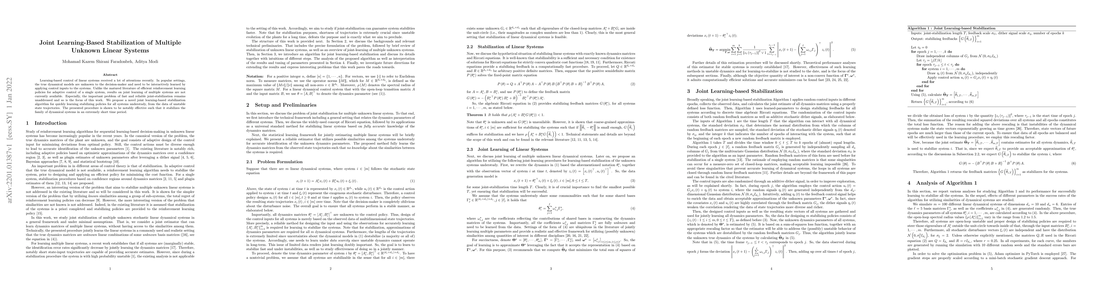 This paper proposes a novel joint learning-based stabilization algorithm for multiple unknown linear systems, addressing the lack of research on adaptive control for several systems simultaneously. The method effectively learns stabilizing policies from unstable state trajectories, achieving rapid and reliable stabilization.