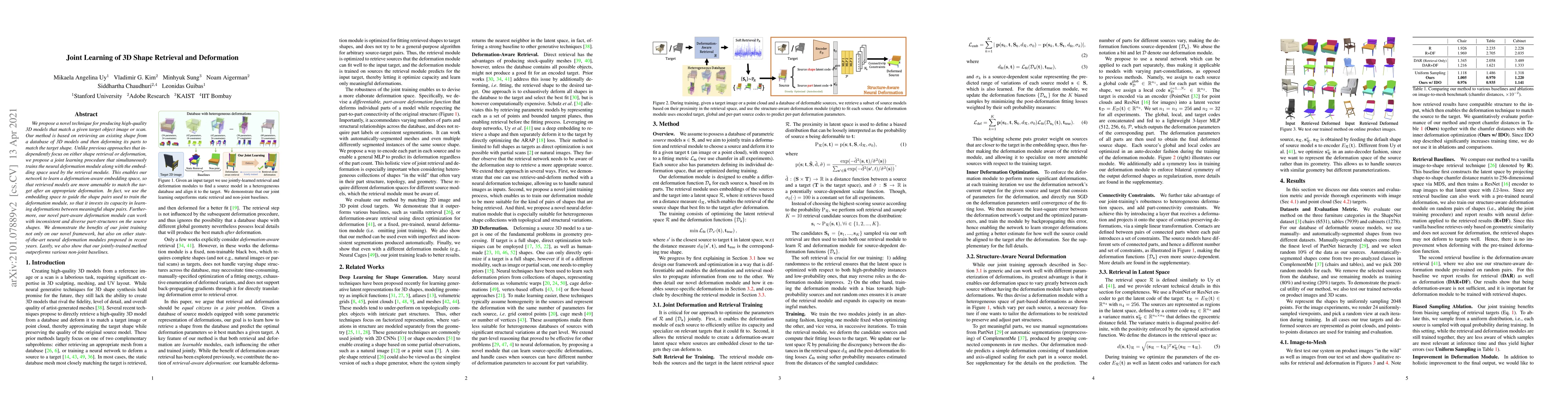 This paper introduces a joint learning technique for 3D shape retrieval and deformation, training a neural deformation module alongside a retrieval embedding space to produce high-quality 3D models matching target images or scans. The method outperforms non-joint baselines and adapts to diverse part-structures.