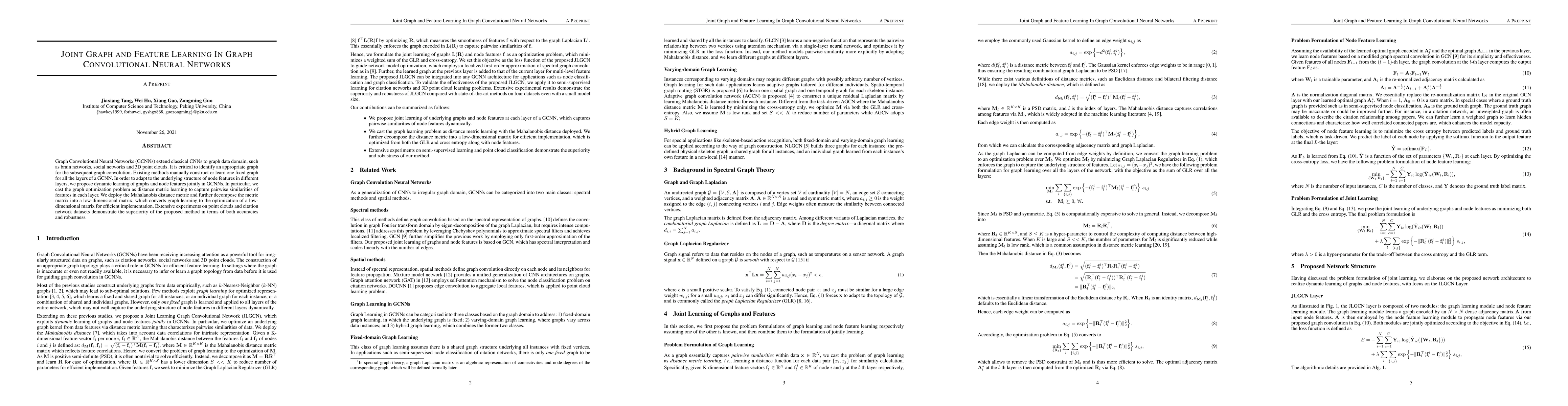 This paper proposes a method for dynamically learning both graph representations and node features in Graph Convolutional Neural Networks (GCNNs) to better adapt to varying node feature structures across layers. It employs distance metric learning with the Mahalanobis distance metric and decomposes the metric matrix for efficient optimization, demonstrating improved accuracy and robustness on point cloud and citation network datasets.