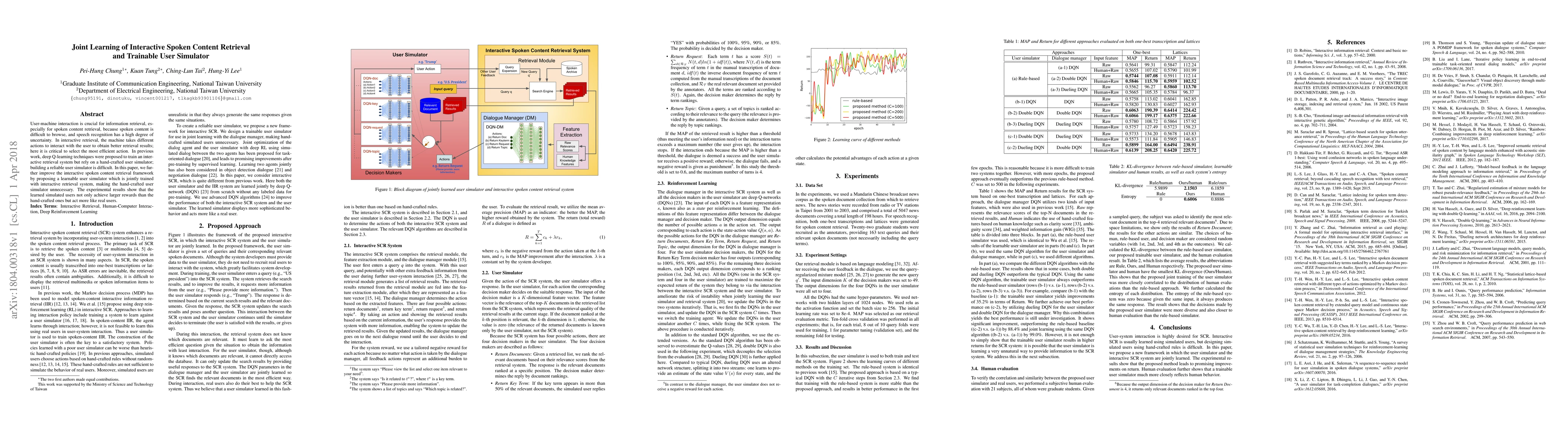 This paper proposes a joint learning framework for interactive spoken content retrieval and a trainable user simulator, eliminating the need for hand-crafted simulators. Experimental results demonstrate that the learned user simulators achieve better performance and more realistic behavior compared to traditional methods.