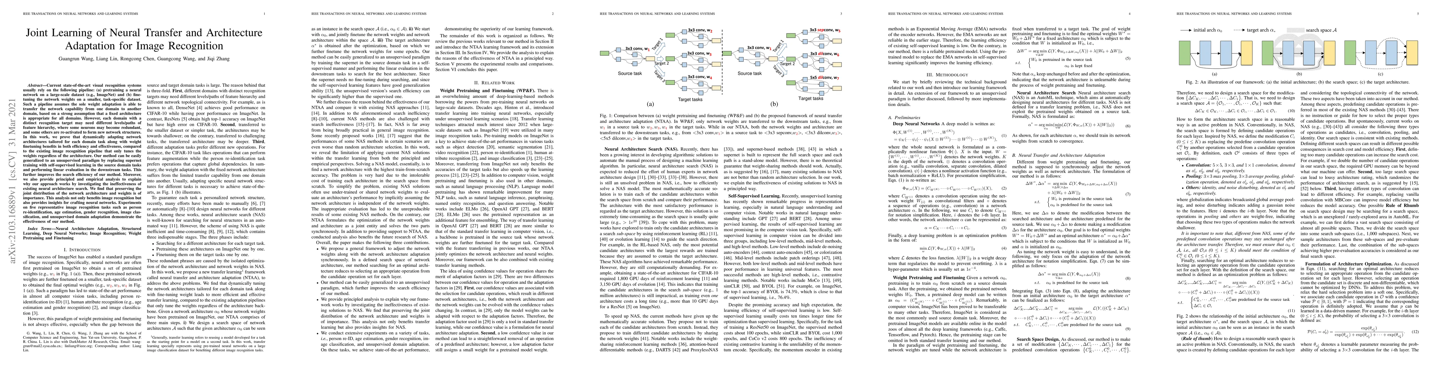 Current state-of-the-art visual recognition systems usually rely on the following pipeline: (a) pretraining a neural network on a large-scale dataset (e.g., ImageNet) and (b) finetuning the network weights on a smaller, task-specific dataset. Such a pipeline assumes the sole weight adaptation is able to transfer the network capability from one domain to another domain, based on a strong assumption that a fixed architecture is appropriate for all domains. However, each domain with a distinct recognition target may need different levels/paths of feature hierarchy, where some neurons may become redundant, and some others are re-activated to form new network structures. In this work, we prove that dynamically adapting network architectures tailored for each domain task along with weight finetuning benefits in both efficiency and effectiveness, compared to the existing image recognition pipeline that only tunes the weights regardless of the architecture. Our method can be easily generalized to an unsupervised paradigm by replacing supernet training with self-supervised learning in the source domain tasks and performing linear evaluation in the downstream tasks. This further improves the search efficiency of our method. Moreover, we also provide principled and empirical analysis to explain why our approach works by investigating the ineffectiveness of existing neural architecture search. We find that preserving the joint distribution of the network architecture and weights is of importance. This analysis not only benefits image recognition but also provides insights for crafting neural networks. Experiments on five representative image recognition tasks such as person re-identification, age estimation, gender recognition, image classification, and unsupervised domain adaptation demonstrate the effectiveness of our method.