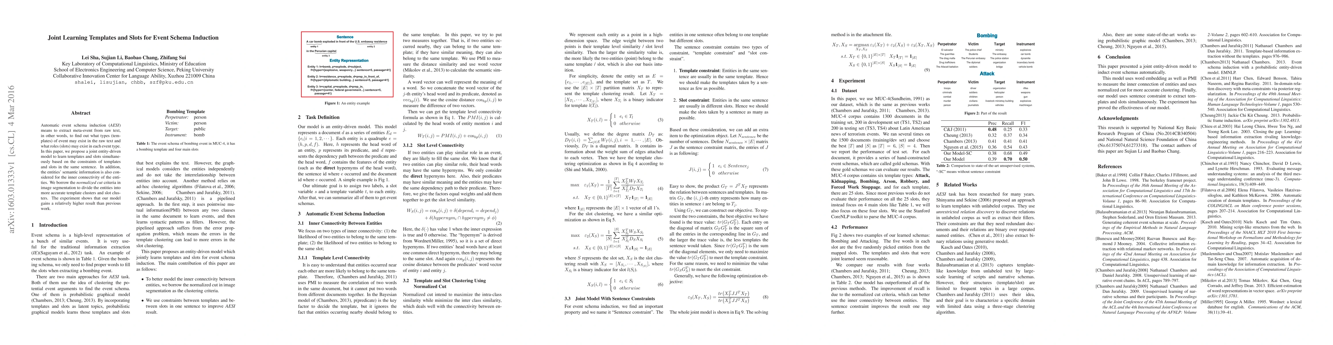 This paper proposes a joint entity-driven model for automatic event schema induction, which simultaneously learns event templates and slots based on sentence constraints and entities' semantic information. The model uses normalized cut criteria to cluster entities more accurately, achieving better results than previous methods.