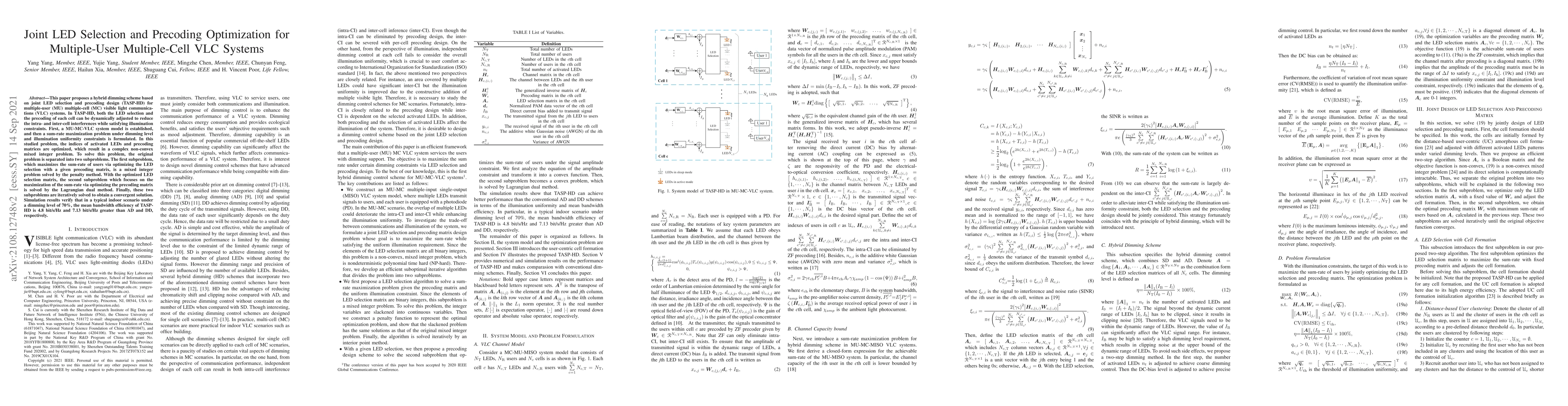 This paper proposes a hybrid dimming scheme (TASP-HD) for multiple-user multiple-cell visible light communication systems, optimizing LED selection and precoding to reduce interference while meeting illumination constraints. The scheme iteratively solves two subproblems: one for LED selection and another for precoding optimization, achieving higher bandwidth efficiency compared to alternative methods.