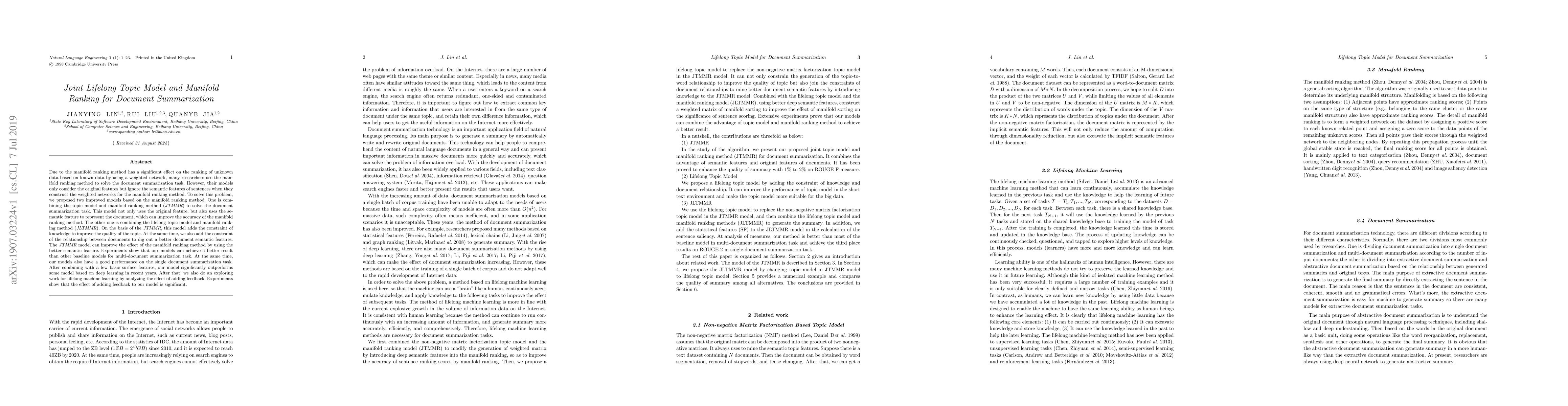 This paper proposes two improved manifold ranking models for document summarization: JTMMR and JLTMMR, which incorporate semantic features and lifelong topic modeling to enhance summarization accuracy. Experiments show superior performance over baseline models and deep learning approaches, and adding feedback further improves results.