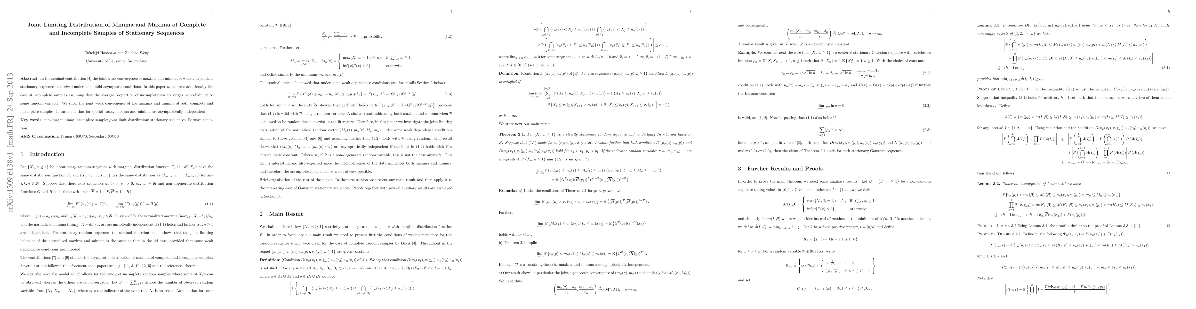 In the seminal contribution [4] the joint weak convergence of maxima and minima of weakly dependent stationary sequences is derived under some mild asymptotic conditions. In this paper we address additionally the case of incomplete samples assuming that the average proportion of incompleteness converges in probability to some random variable. We show the joint weak convergence of the maxima and minima of both complete and incomplete samples. It turns out that for special cases, maxima and minima are asymptotically independent.