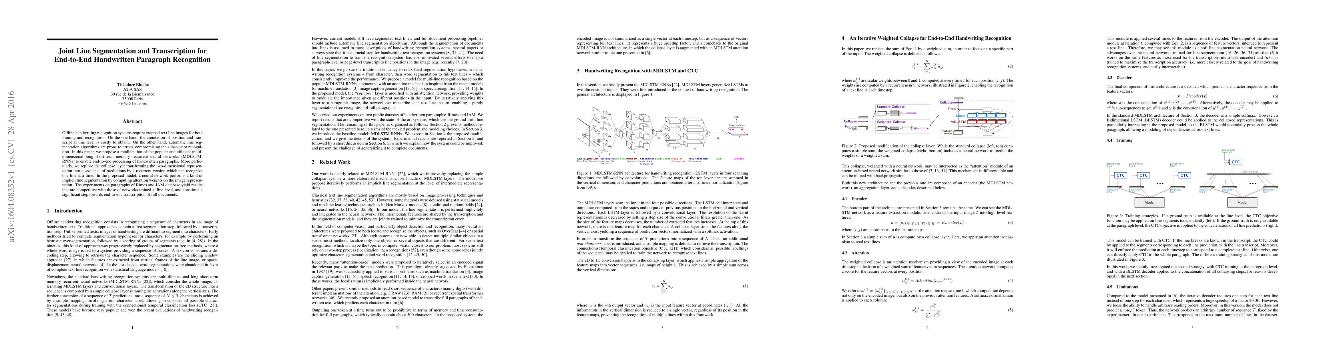 This paper proposes a modified MDLSTM-RNN model for end-to-end handwritten paragraph recognition that implicitly segments lines through attention weights, achieving competitive results compared to line-level trained networks. The approach reduces the need for costly line-level annotations and errors from manual segmentation.