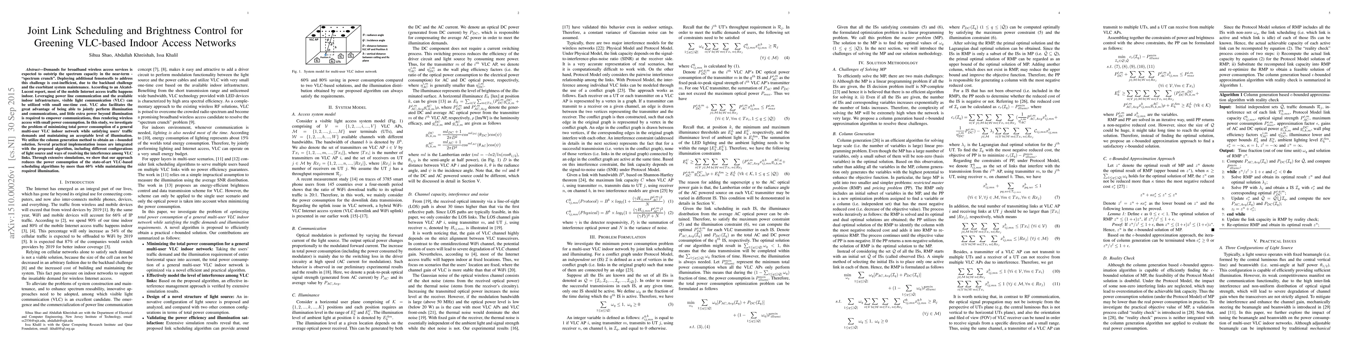 This paper proposes a joint link scheduling and brightness control method for VLC-based indoor networks to minimize power consumption while meeting user traffic demands and maintaining acceptable illumination levels. The column generation method is used to achieve an $\epsilon$-bounded solution, and simulations show a 60% reduction in power usage compared to existing algorithms.