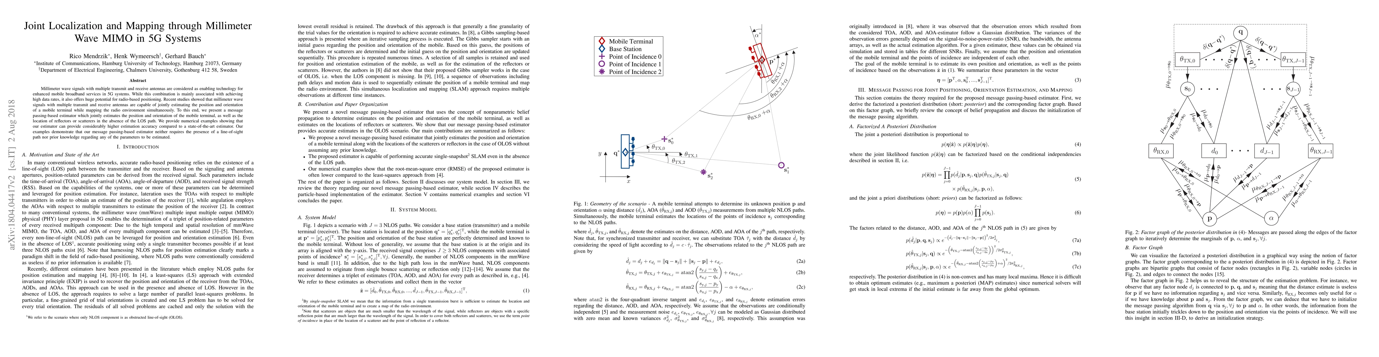 This paper proposes a message passing-based estimator for joint localization and mapping using millimeter wave MIMO in 5G systems, demonstrating higher accuracy than existing methods without requiring line-of-sight paths or prior parameter knowledge. The approach simultaneously estimates the mobile terminal's position, orientation, and the location of environmental reflectors.