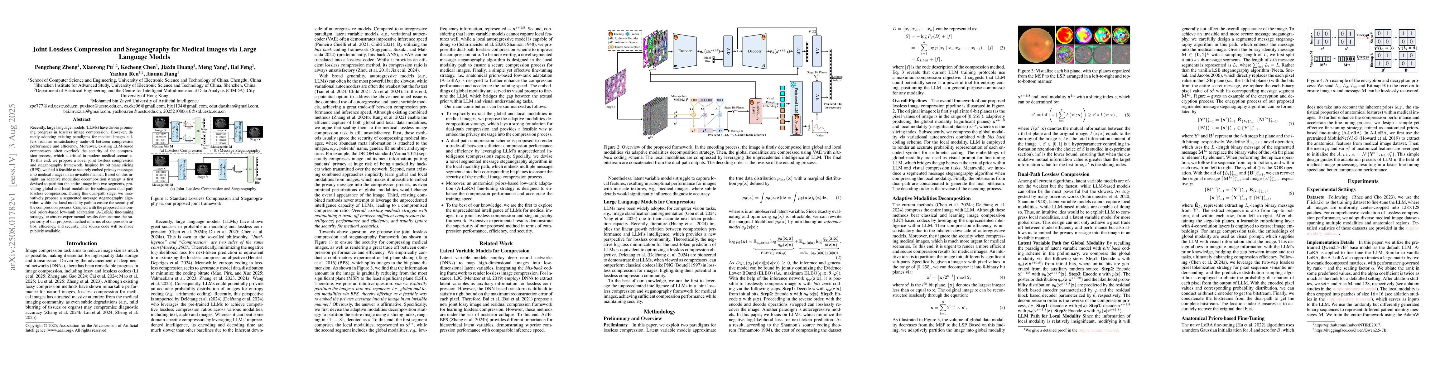 Recently, large language models (LLMs) have driven promis ing progress in lossless image compression. However, di rectly adopting existing paradigms for medical images suf fers from an unsatisfactory trade-off between compression performance and efficiency. Moreover, existing LLM-based compressors often overlook the security of the compres sion process, which is critical in modern medical scenarios. To this end, we propose a novel joint lossless compression and steganography framework. Inspired by bit plane slicing (BPS), we find it feasible to securely embed privacy messages into medical images in an invisible manner. Based on this in sight, an adaptive modalities decomposition strategy is first devised to partition the entire image into two segments, pro viding global and local modalities for subsequent dual-path lossless compression. During this dual-path stage, we inno vatively propose a segmented message steganography algo rithm within the local modality path to ensure the security of the compression process. Coupled with the proposed anatom ical priors-based low-rank adaptation (A-LoRA) fine-tuning strategy, extensive experimental results demonstrate the su periority of our proposed method in terms of compression ra tios, efficiency, and security. The source code will be made publicly available.