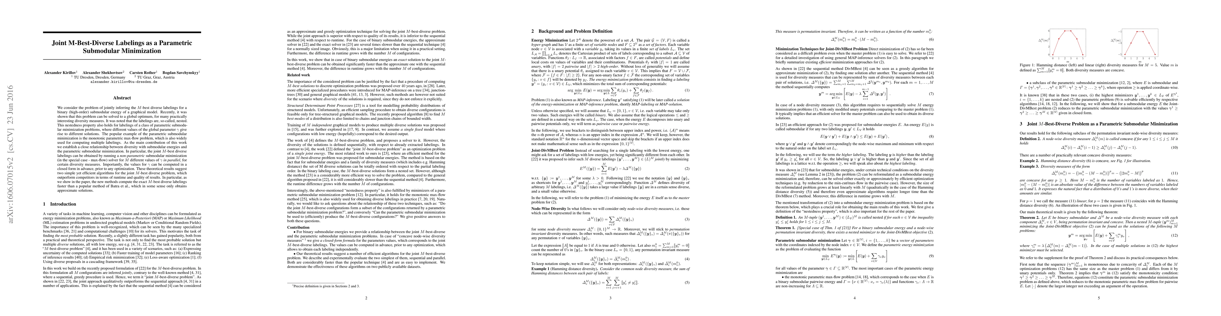 This paper establishes a connection between jointly inferring M-best diverse labelings for submodular energies and parametric submodular minimization, showing that the nestedness property allows for efficient computation of diverse labelings. The authors propose two algorithms leveraging this relationship, which outperform existing methods in both runtime and solution quality.