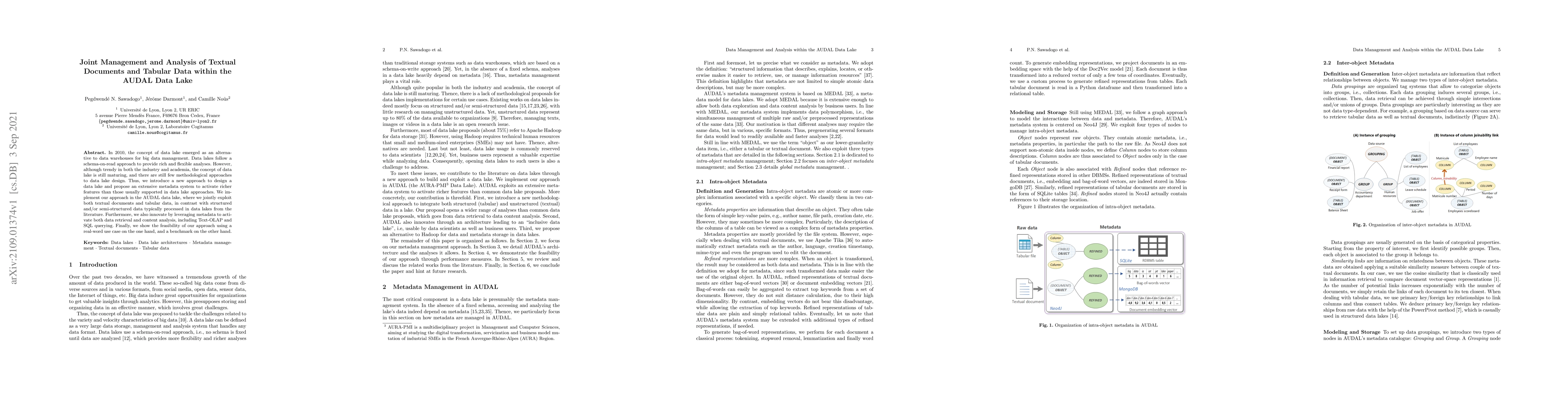 This paper introduces a novel approach to designing data lakes that integrates both textual documents and tabular data, proposing a comprehensive metadata system to enhance data retrieval and content analysis through Text-OLAP and SQL querying. The AUDAL data lake implementation demonstrates the feasibility of this approach via a real-world use case and benchmark.