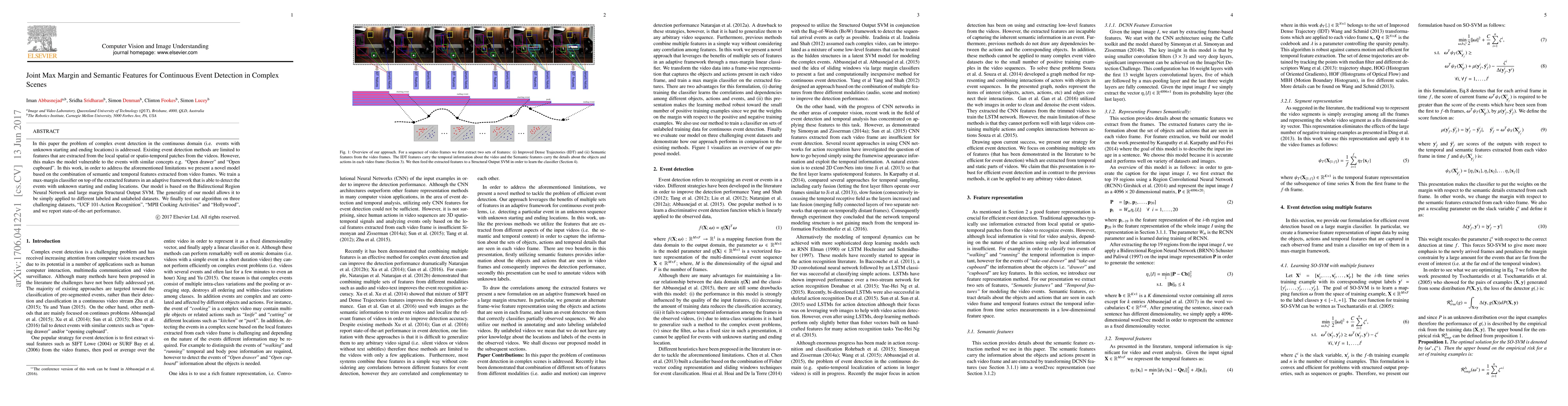 In this paper the problem of complex event detection in the continuous domain (i.e. events with unknown starting and ending locations) is addressed. Existing event detection methods are limited to features that are extracted from the local spatial or spatio-temporal patches from the videos. However, this makes the model vulnerable to the events with similar concepts e.g. "Open drawer" and "Open cupboard". In this work, in order to address the aforementioned limitations we present a novel model based on the combination of semantic and temporal features extracted from video frames. We train a max-margin classifier on top of the extracted features in an adaptive framework that is able to detect the events with unknown starting and ending locations. Our model is based on the Bidirectional Region Neural Network and large margin Structural Output SVM. The generality of our model allows it to be simply applied to different labeled and unlabeled datasets. We finally test our algorithm on three challenging datasets, "UCF 101-Action Recognition", "MPII Cooking Activities" and "Hollywood", and we report state-of-the-art performance.