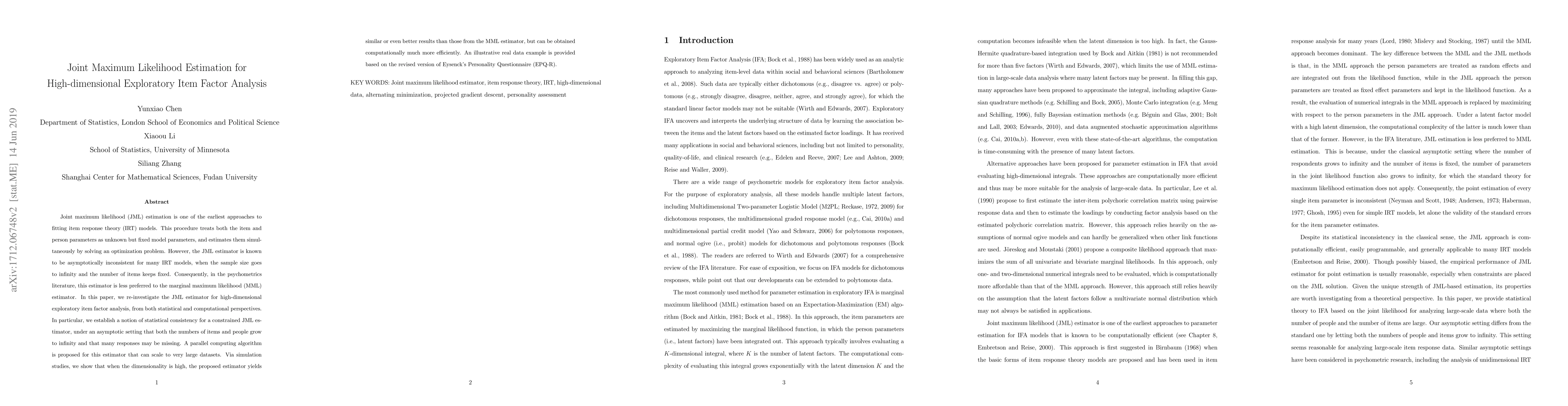 This paper re-examines the joint maximum likelihood (JML) estimator for high-dimensional exploratory item response analysis, establishing its statistical consistency under large sample sizes and proposing a scalable parallel computing algorithm. Simulation results show that the JML estimator can outperform or match the marginal maximum likelihood (MML) estimator in high-dimensional settings while being more computationally efficient.
