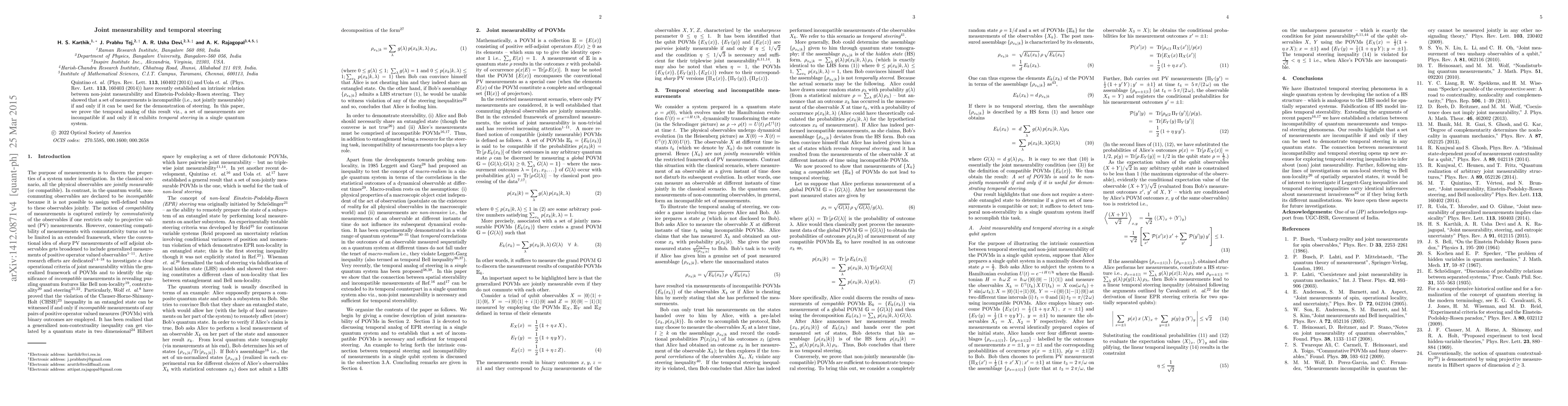 This paper proves that a set of measurements is incompatible (not jointly measurable) if and only if it exhibits temporal steering, extending the established relationship between non-joint measurability and Einstein-Podolsky-Rosen steering to the temporal domain.