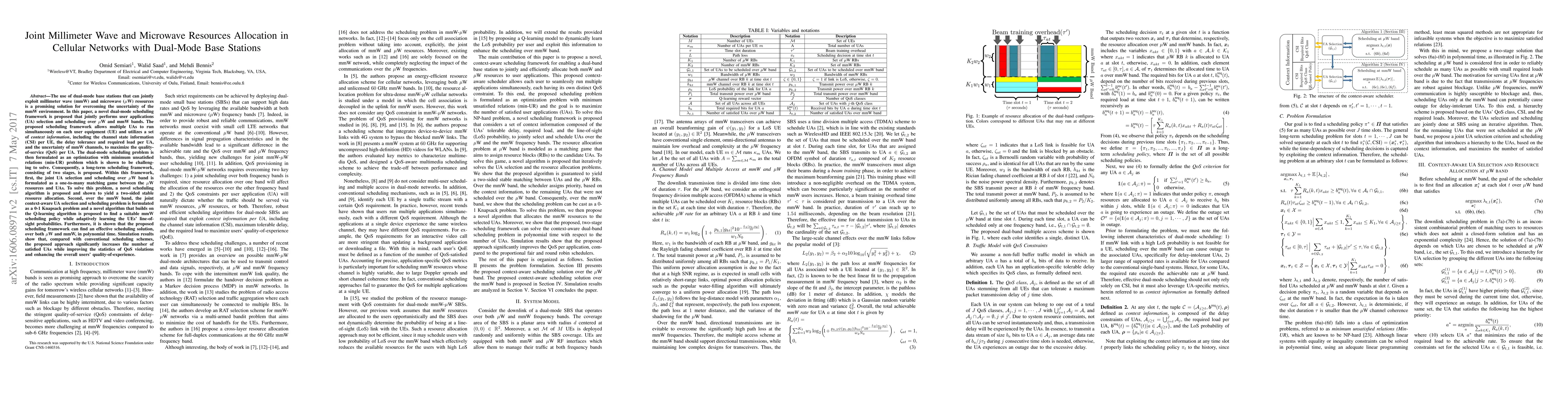 In this paper, a novel dual-mode scheduling framework is proposed that jointly performs user applications (UA) selection and scheduling over microwave ($\mu$W) and millimeter wave (mmW) bands. The proposed scheduling framework utilizes a set of context information, including the channel state information, the delay tolerance and required load per UA, and the uncertainty of mmW channels, to maximize the quality-of-service (QoS) per UA. The scheduling problem is formulated as an optimization with minimum unsatisfied relations (min-UR) problem which is shown to be challenging to solve. Consequently, a long-term scheduling framework, consisting of two stages, is proposed. Within this framework, first, the scheduling over $\mu$W band is formulated as a matching game and to solve this problem, a novel algorithm is proposed and shown to yield a two-sided stable resource allocation. Second, over the mmW band, the scheduling problem is formulated as a 0-1 Knapsack problem and a novel algorithm is proposed to solve it. Furthermore, it is shown that the proposed framework can find an effective scheduling solution, over both $\mu$W and mmW, in polynomial time. Simulation results show that, compared with conventional scheduling schemes, the proposed approach significantly increases the number of satisfied UAs and enhances the users' quality-of-experience.
