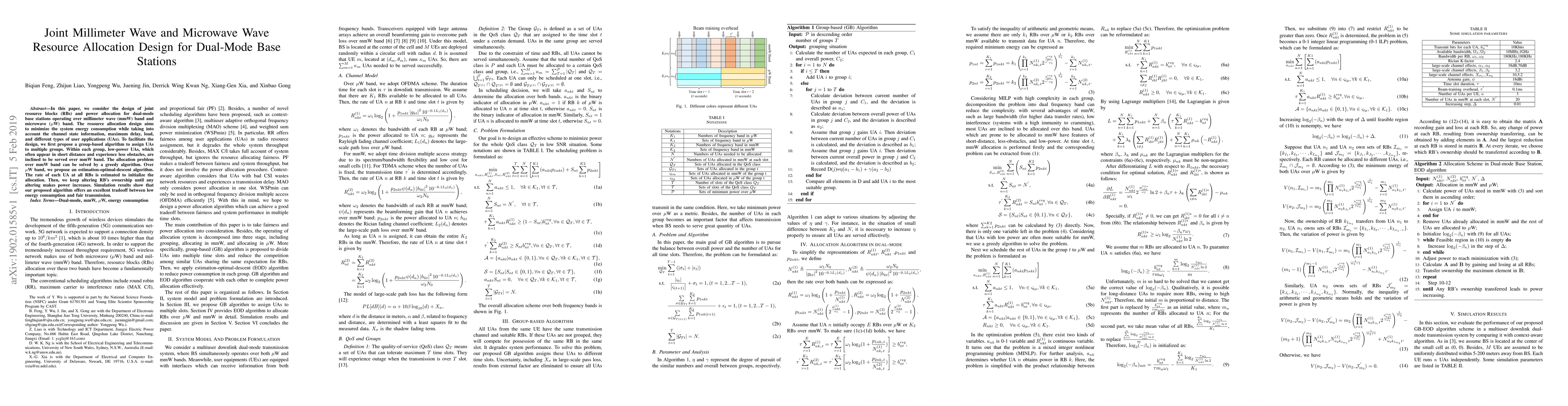 This paper proposes a joint resource and power allocation design for dual-mode base stations operating over millimeter wave and microwave bands to minimize energy consumption. It introduces a group-based algorithm for user assignment and employs greedy and estimation-optimal-descent algorithms for resource allocation, achieving a balance between low energy use and fair transmission.