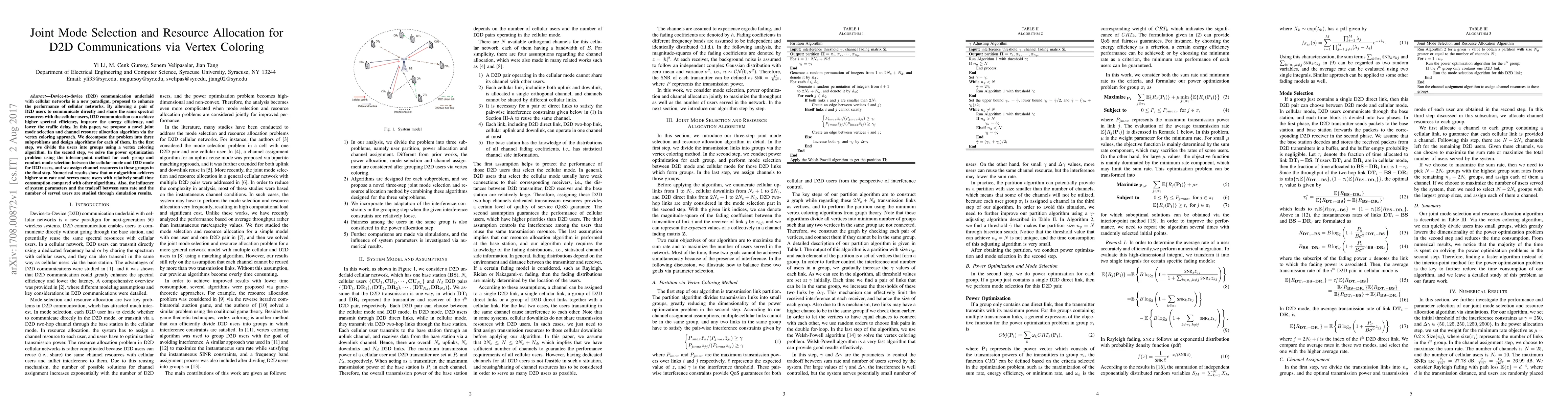 This paper proposes a joint mode selection and resource allocation algorithm for D2D communications using vertex coloring, decomposing the problem into three subproblems and employing the interior-point method for power optimization. The algorithm achieves better sum rate and serves more users efficiently compared to other methods.
