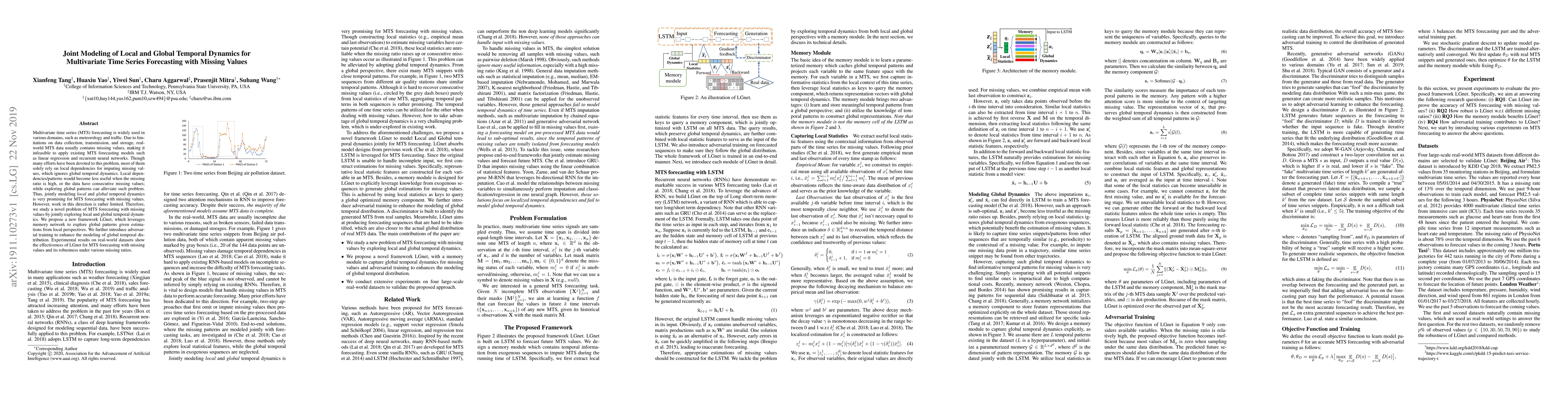 This paper proposes LGnet, a novel framework for multivariate time series forecasting with missing values by jointly modeling local and global temporal dynamics. LGnet leverages memory networks to explore global patterns and adversarial training to enhance global temporal distribution modeling, demonstrating effectiveness and robustness in experiments.
