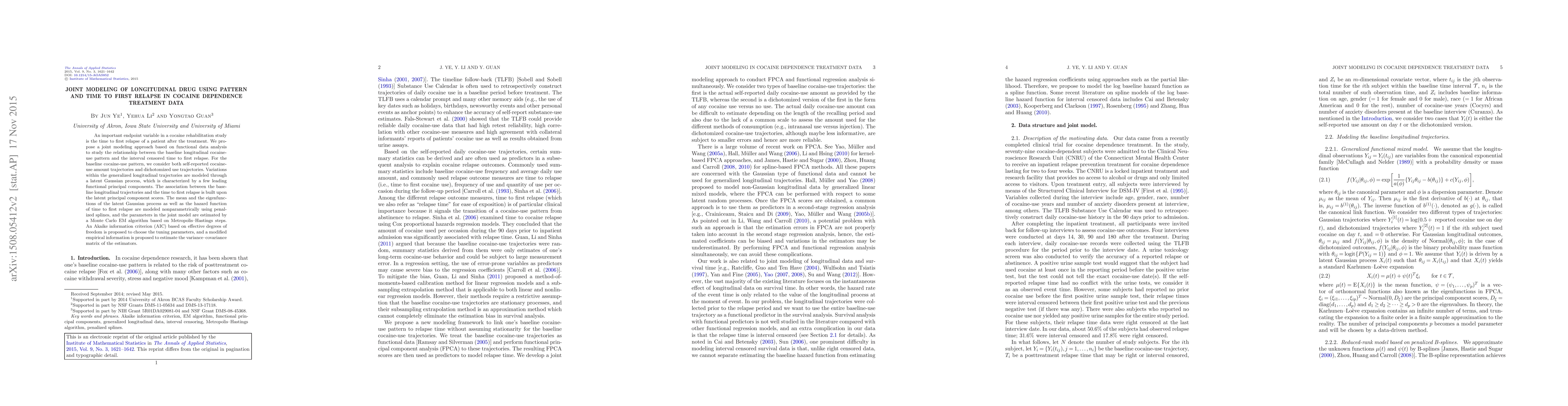 This paper proposes a joint modeling approach to study the relationship between baseline longitudinal cocaine-use patterns and time to first relapse in cocaine dependence treatment. The model uses functional data analysis and latent Gaussian processes to characterize the cocaine-use trajectories and employs penalized splines for nonparametric modeling, with parameter estimation via a Monte Carlo EM algorithm.