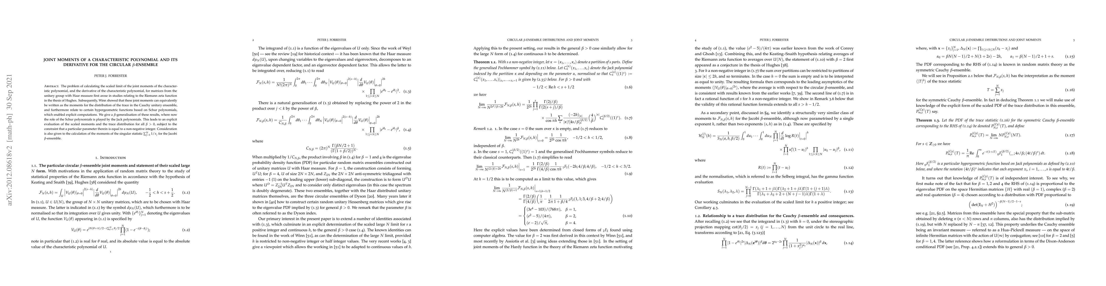 The problem of calculating the scaled limit of the joint moments of the characteristic polynomial, and the derivative of the characteristic polynomial, for matrices from the unitary group with Haar measure first arose in studies relating to the Riemann zeta function in the thesis of Hughes. Subsequently, Winn showed that these joint moments can equivalently be written as the moments for the distribution of the trace in the Cauchy unitary ensemble, and furthermore relate to certain hypergeometric functions based on Schur polynomials, which enabled explicit computations. We give a $\beta$-generalisation of these results, where now the role of the Schur polynomials is played by the Jack polynomials. This leads to an explicit evaluation of the scaled moments for all $\beta > 0$, subject to the constraint that a particular parameter therein is equal to a non negative integer. Consideration is also given to the calculation of the moments of the singular statistic $\sum_{j=1}^N 1/x_j$ for the Jacobi $\beta$-ensemble.