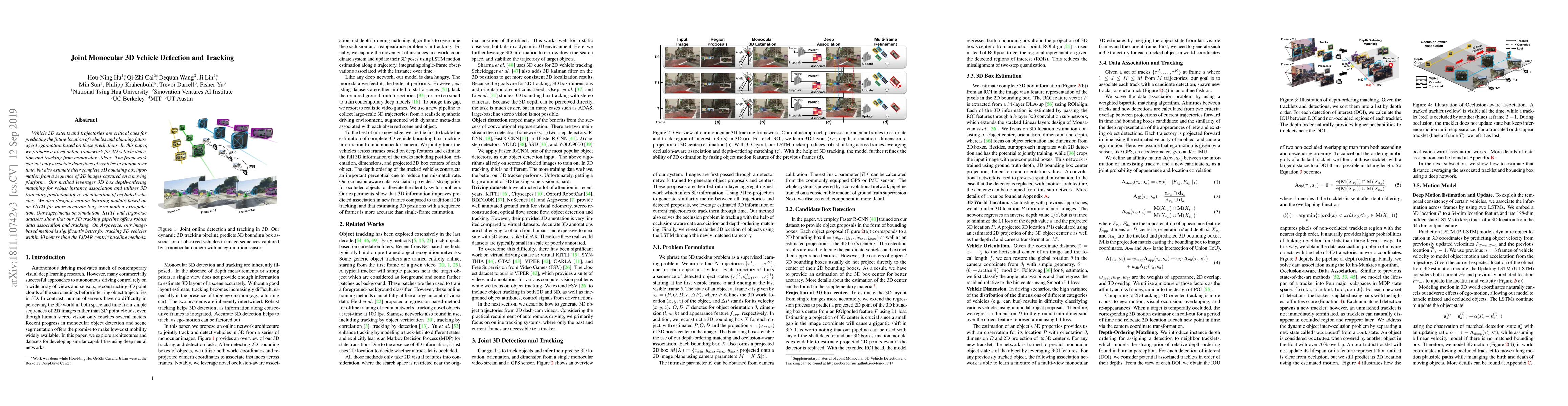This paper presents an online framework for 3D vehicle detection and tracking from monocular videos, utilizing 3D box depth-ordering matching and LSTM-based motion learning for robust instance association and long-term motion prediction. Experiments demonstrate superior performance in tracking 3D vehicles compared to LiDAR-centric baselines on Argoverse.