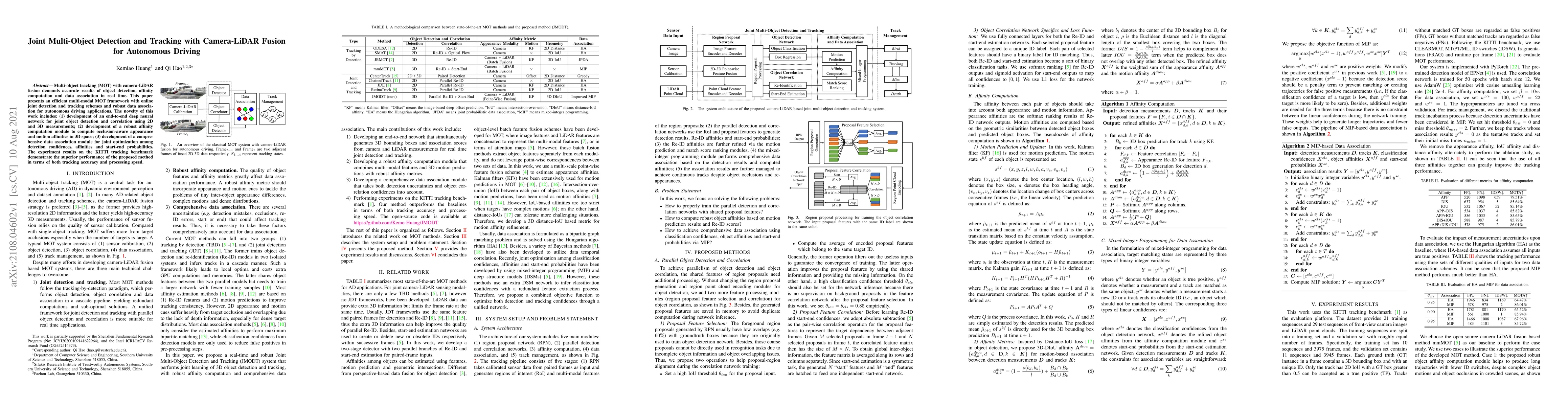 This paper proposes a multi-modal framework for joint multi-object detection and tracking using camera-LiDAR fusion, featuring a deep neural network for 2D/3D joint detection, an occlusion-aware affinity computation module, and a robust data association method, achieving superior tracking accuracy and speed on the KITTI dataset.