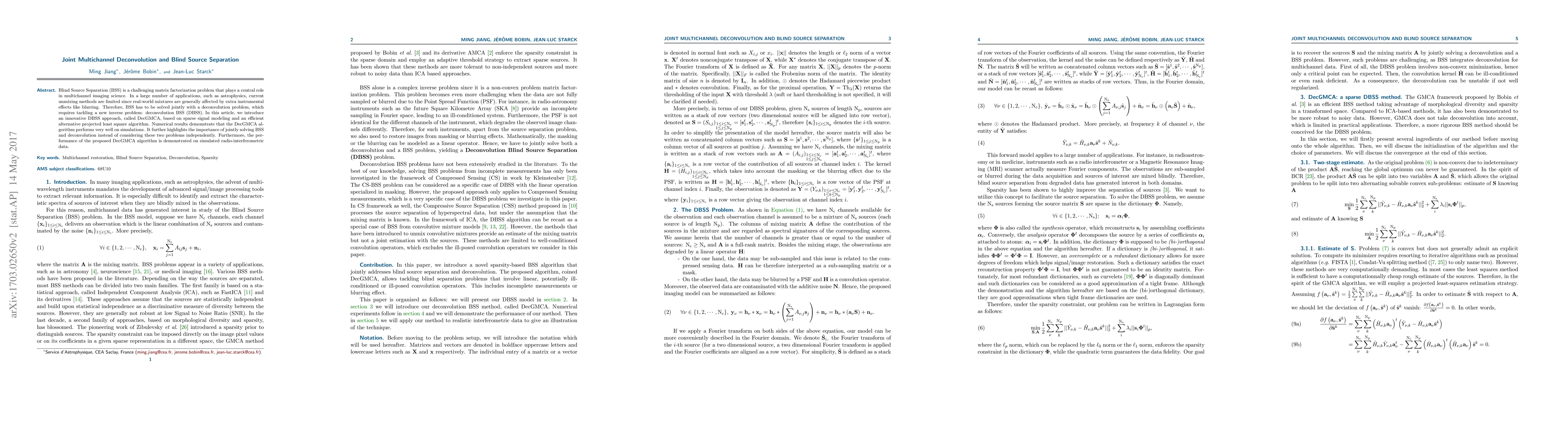 This paper introduces a novel DecGMCA algorithm for joint multichannel deconvolution and blind source separation (DBSS), addressing limitations of current unmixing methods in applications like astrophysics. The DecGMCA approach, based on sparse signal modeling and an efficient algorithm, outperforms traditional methods, demonstrating the benefits of solving BSS and deconvolution jointly.