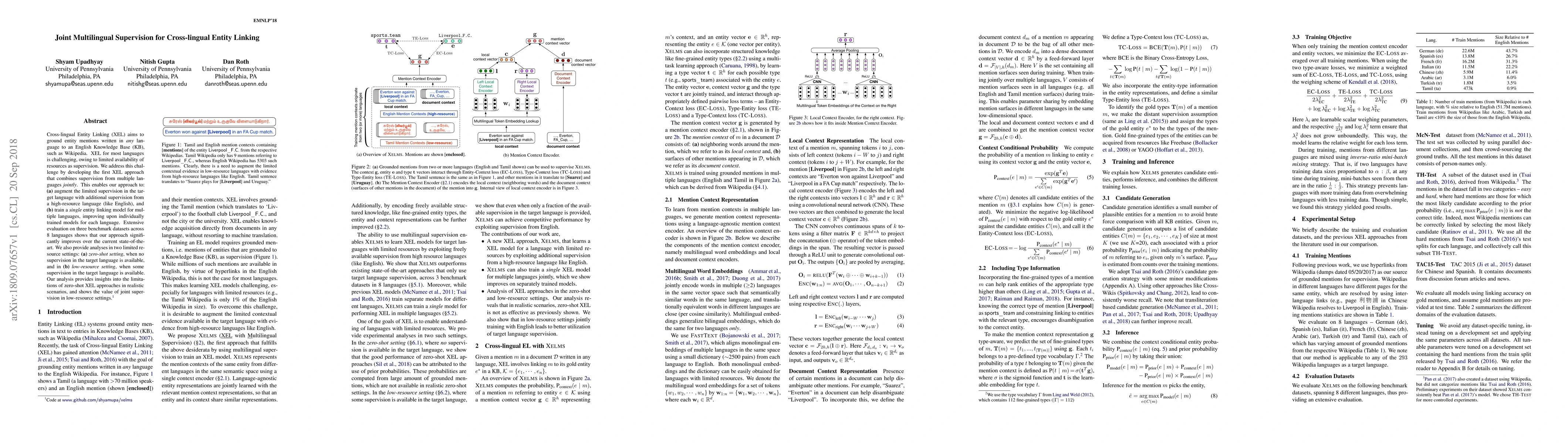 This paper proposes a joint multilingual supervision method for Cross-lingual Entity Linking (XEL), significantly improving performance over state-of-the-art approaches. The approach leverages supervision from multiple languages to augment limited resources in target languages and trains a unified model for multiple languages.