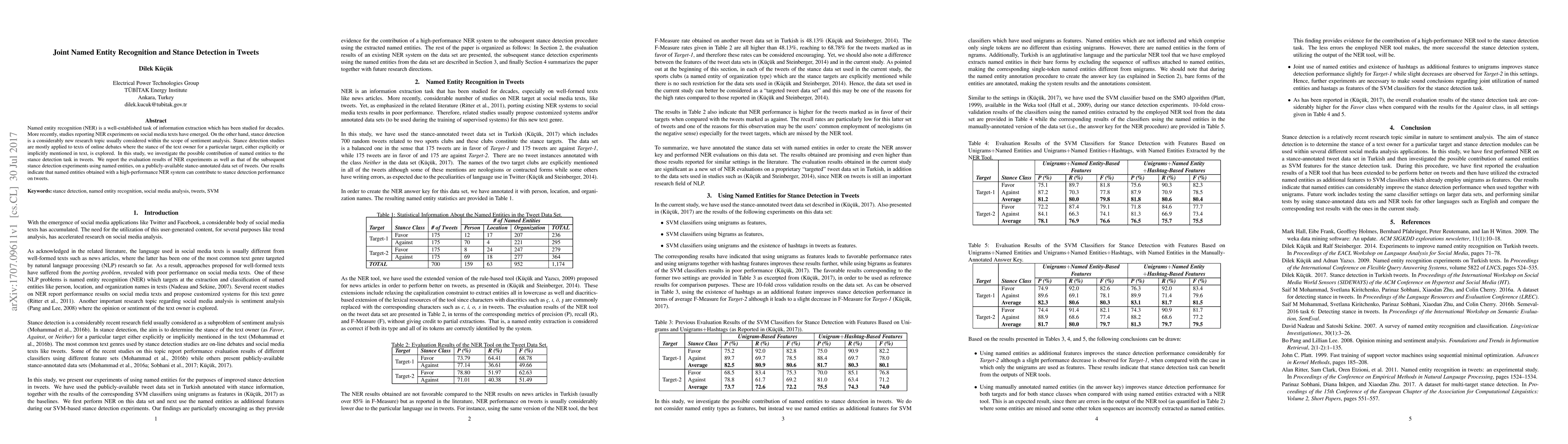 The study first performed named entity recognition (NER) on a stance-annotated tweet dataset in Turkish, and then investigated the possible contribution of named entities as support vector machine (SVM) features for the stance detection task.