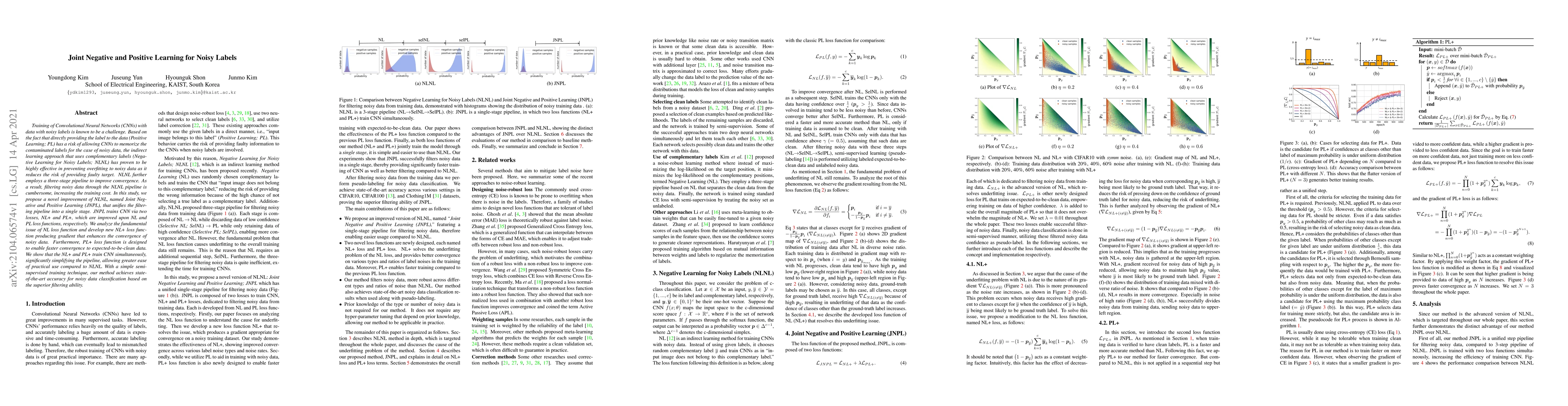 This research paper proposes a novel method called Joint Negative and Positive Learning (JNPL) to address the challenge of training Convolutional Neural Networks (CNNs) with noisy labels. JNPL combines negative and positive learning into a single stage, improving the convergence of CNNs by using enhanced NL+ and PL+ loss functions, which simplify the filtering pipeline and achieve state-of-the-art accuracy for noisy data classification.
