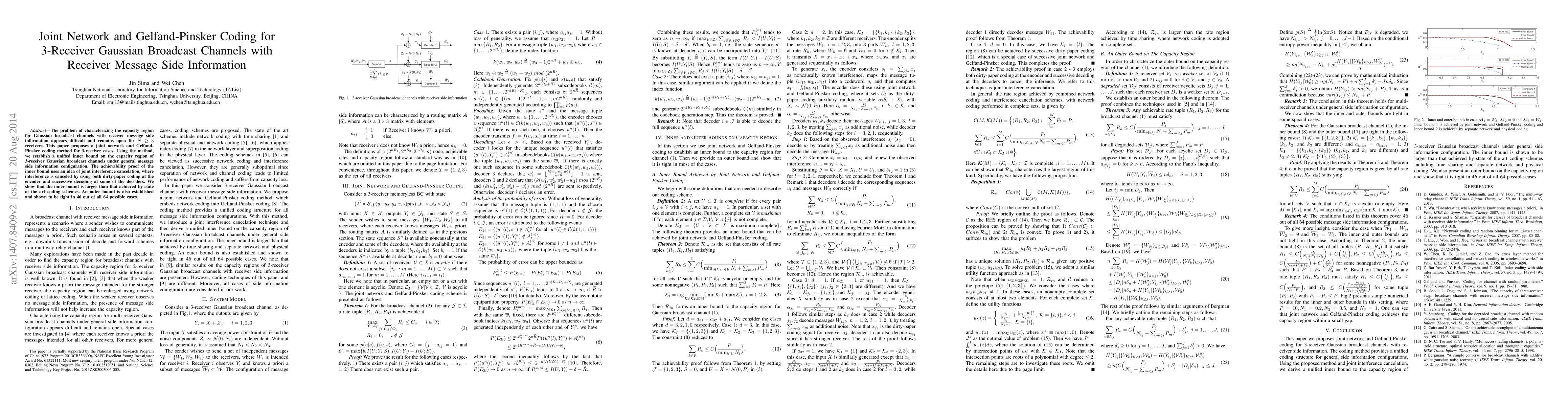 The problem of characterizing the capacity region for Gaussian broadcast channels with receiver message side information appears difficult and remains open for N >= 3 receivers. This paper proposes a joint network and Gelfand-Pinsker coding method for 3-receiver cases. Using the method, we establish a unified inner bound on the capacity region of 3-receiver Gaussian broadcast channels under general message side information configuration. The achievability proof of the inner bound uses an idea of joint interference cancelation, where interference is canceled by using both dirty-paper coding at the encoder and successive decoding at some of the decoders. We show that the inner bound is larger than that achieved by state of the art coding schemes. An outer bound is also established and shown to be tight in 46 out of all 64 possible cases.