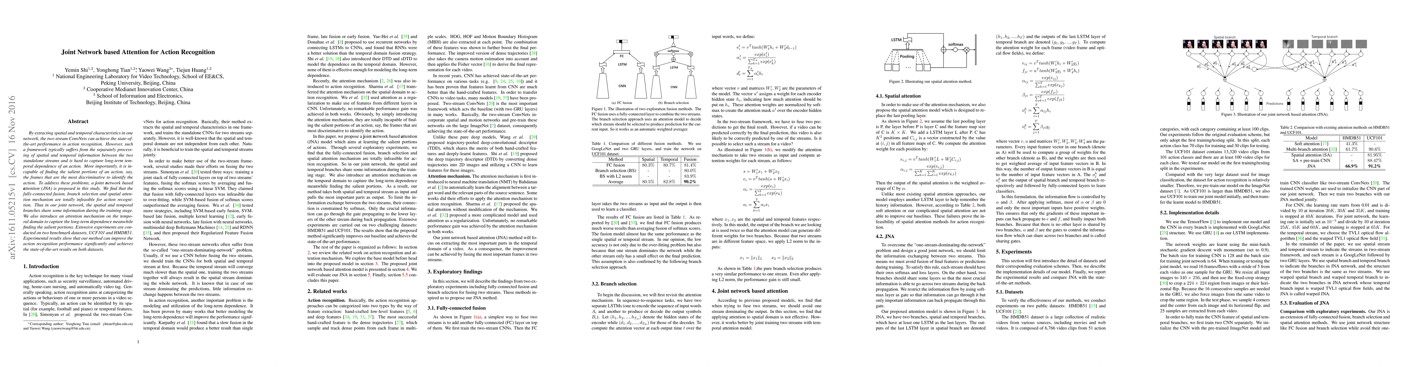 By extracting spatial and temporal characteristics in one network, the two-stream ConvNets can achieve the state-of-the-art performance in action recognition. However, such a framework typically suffers from the separately processing of spatial and temporal information between the two standalone streams and is hard to capture long-term temporal dependence of an action. More importantly, it is incapable of finding the salient portions of an action, say, the frames that are the most discriminative to identify the action. To address these problems, a \textbf{j}oint \textbf{n}etwork based \textbf{a}ttention (JNA) is proposed in this study. We find that the fully-connected fusion, branch selection and spatial attention mechanism are totally infeasible for action recognition. Thus in our joint network, the spatial and temporal branches share some information during the training stage. We also introduce an attention mechanism on the temporal domain to capture the long-term dependence meanwhile finding the salient portions. Extensive experiments are conducted on two benchmark datasets, UCF101 and HMDB51. Experimental results show that our method can improve the action recognition performance significantly and achieves the state-of-the-art results on both datasets.