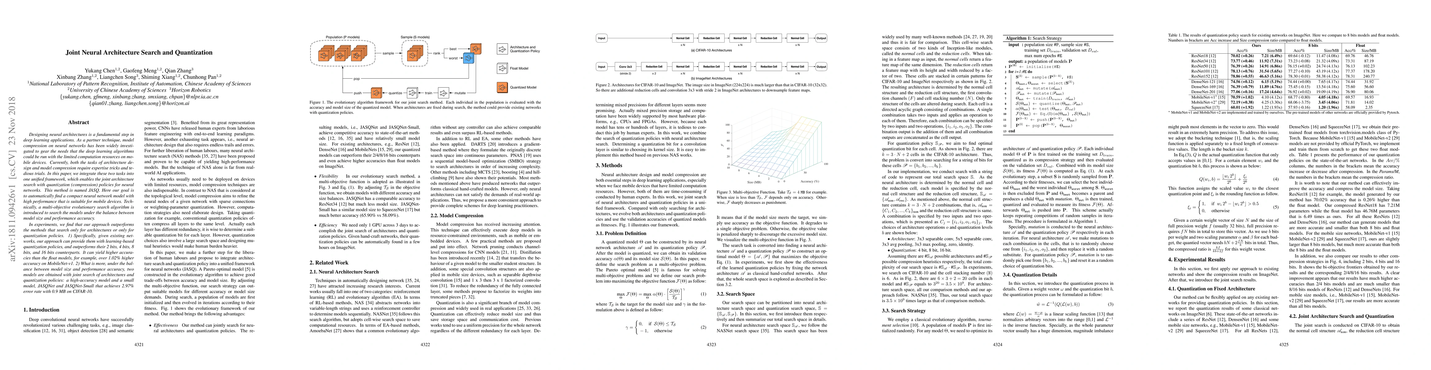 This paper proposes JASQ, a unified framework for joint neural architecture search and quantization to design compact neural networks suitable for mobile devices. Using a multi-objective evolutionary search algorithm, the method balances model size and performance accuracy, outperforming separate architecture search or quantization methods.