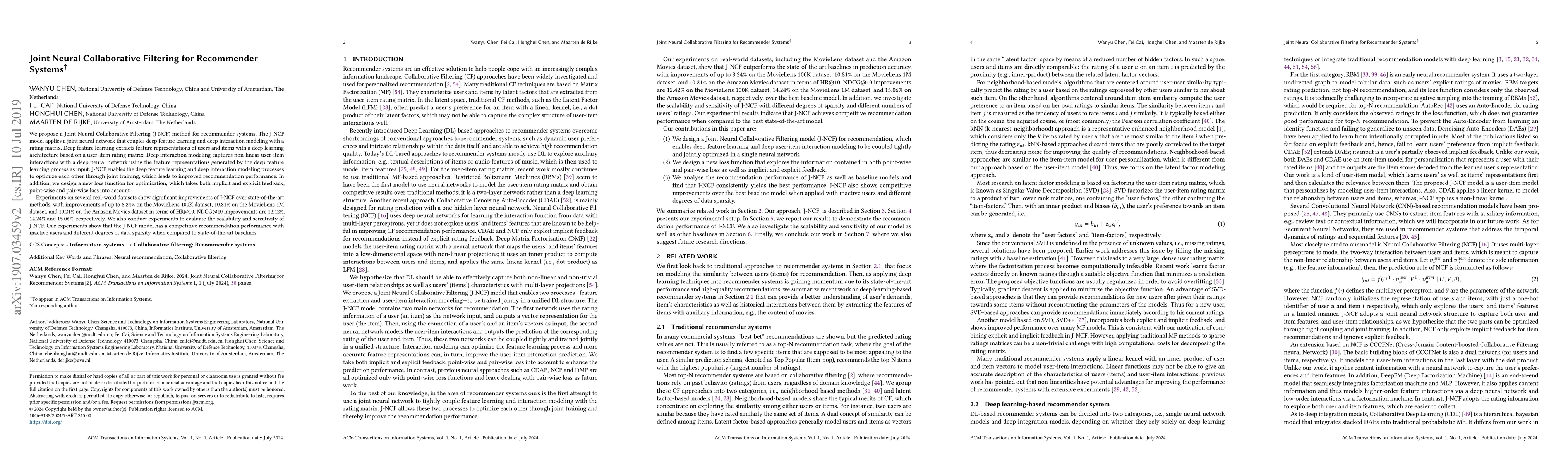 The J-NCF method integrates deep feature learning and deep interaction modeling for recommender systems, achieving significant improvements over state-of-the-art methods by optimizing both processes through joint training, with notable performance gains on multiple datasets. Scalability and sensitivity experiments demonstrate J-NCF's competitive performance under various conditions.